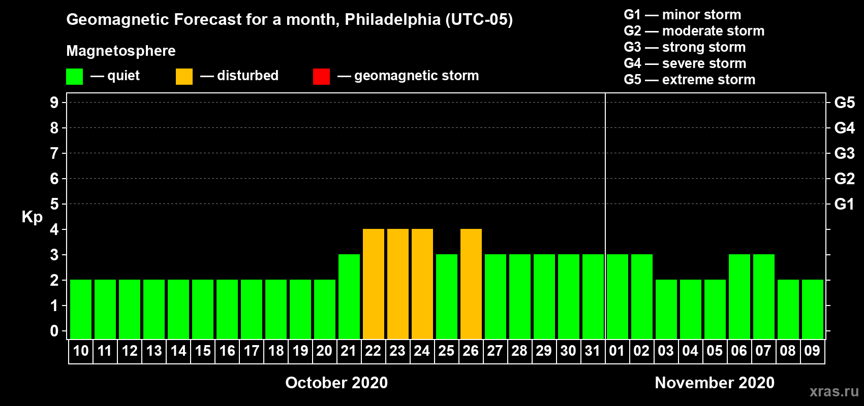Geomagnetic storm forecast in Philadelphia for Oct 10, 2020