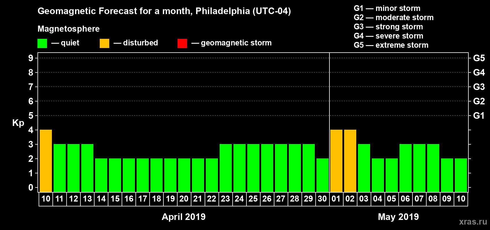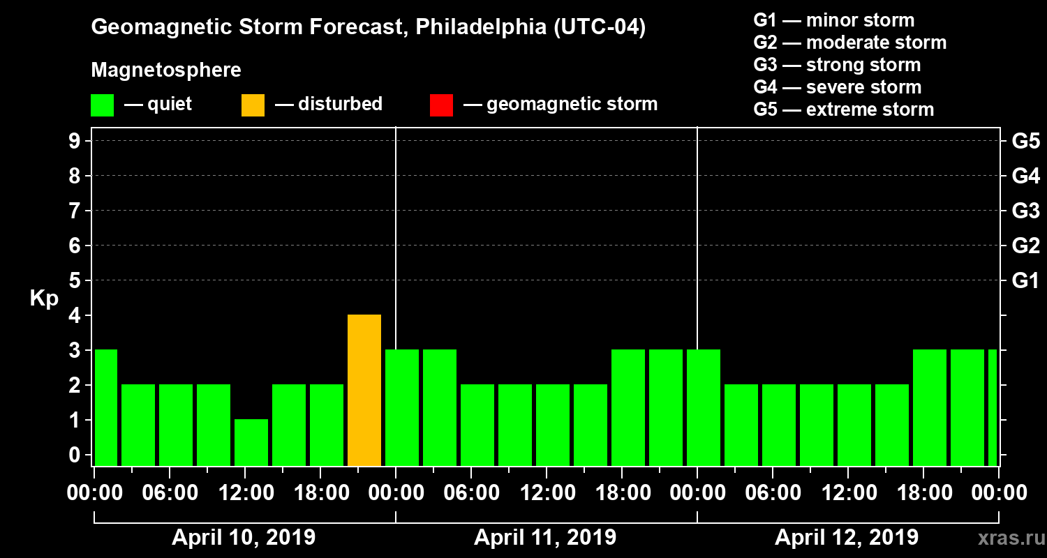 Geomagnetic storm forecast in Philadelphia for Apr 10, 2019