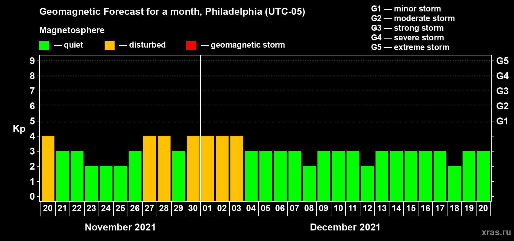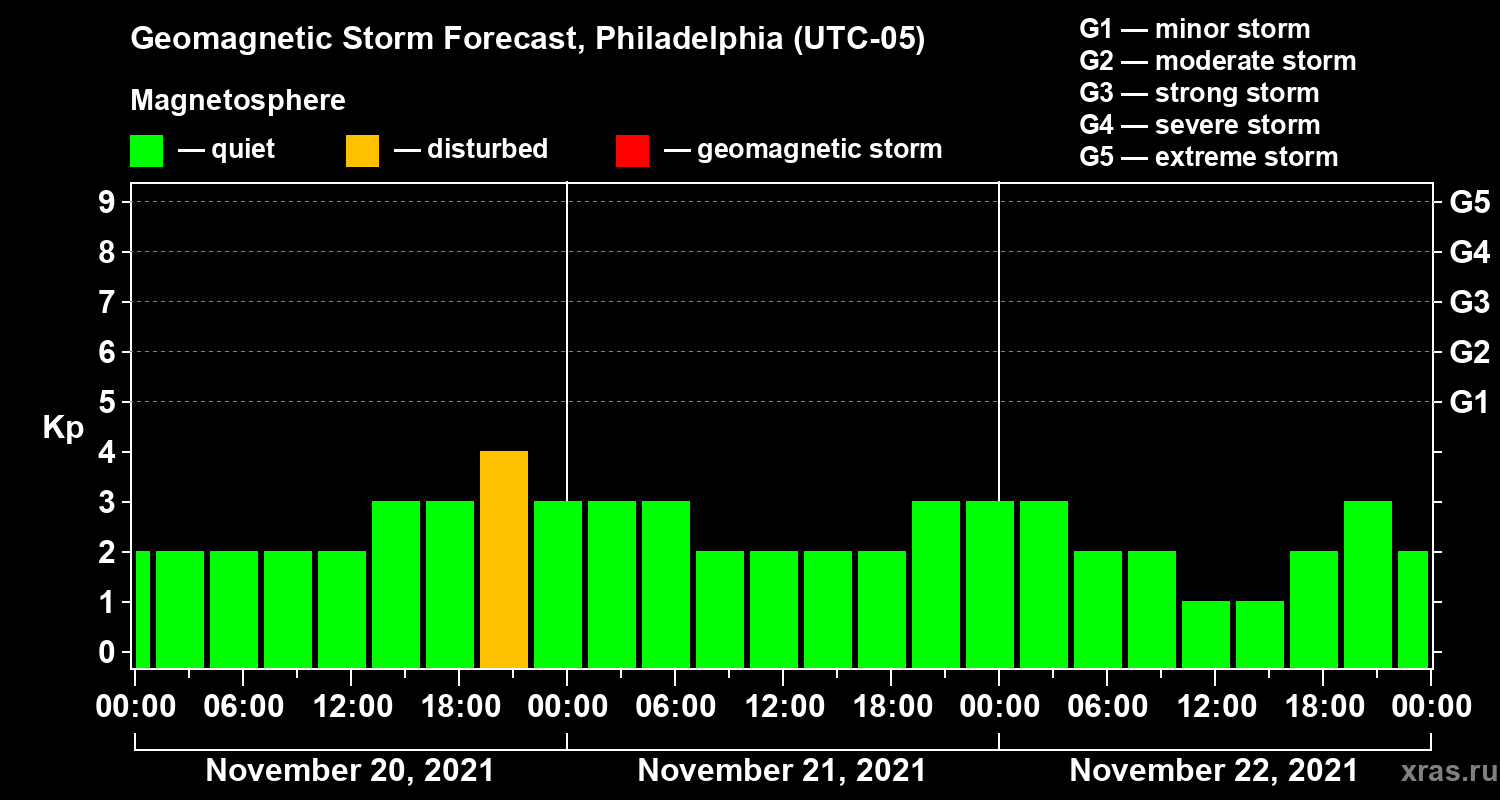 Geomagnetic storm forecast in Philadelphia for Nov 20, 2021