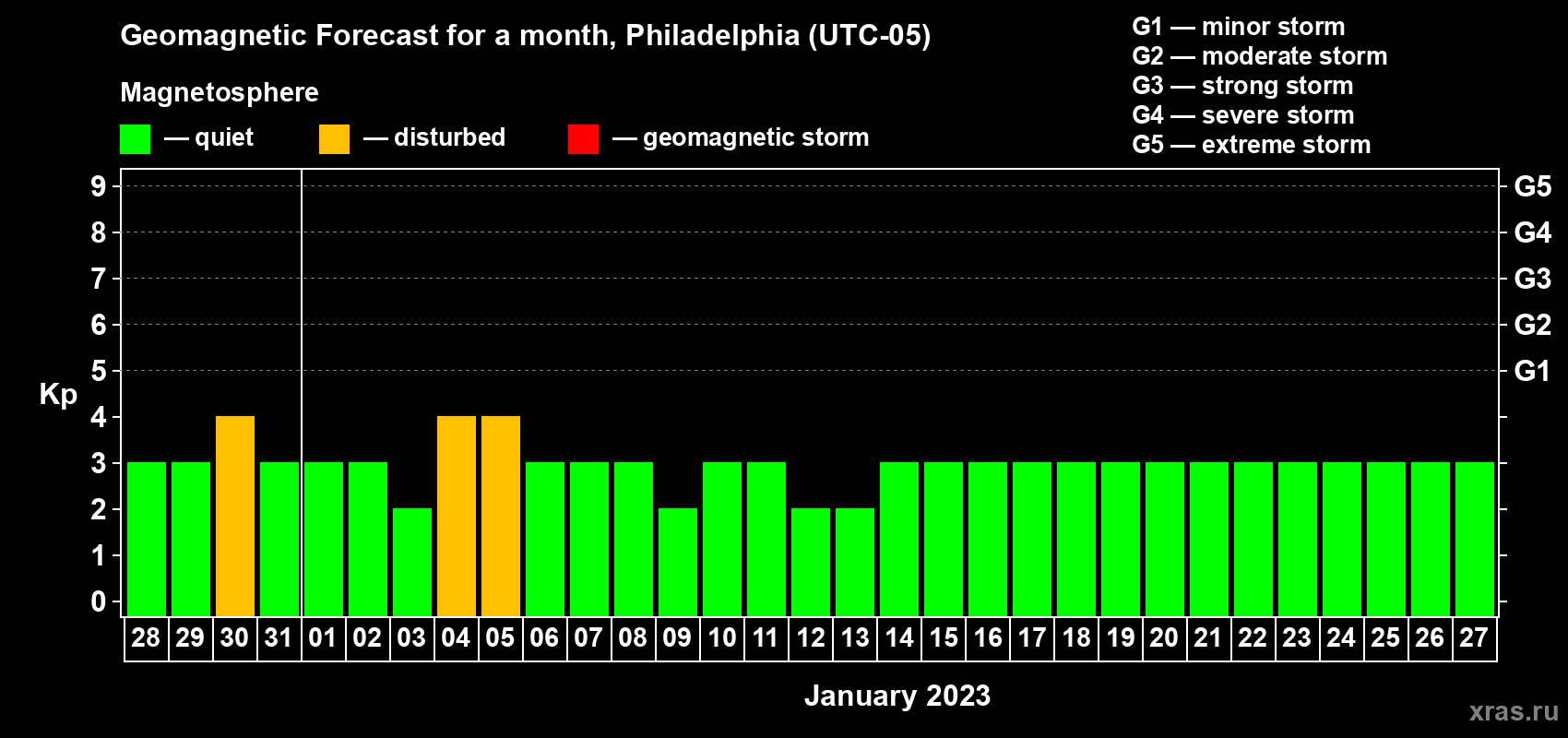 Geomagnetic storm forecast in Philadelphia for Dec 28, 2022