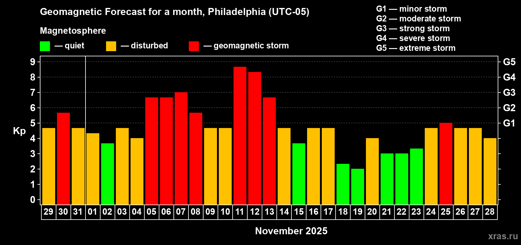 Geomagnetic storm forecast in Philadelphia for Oct 29, 2025