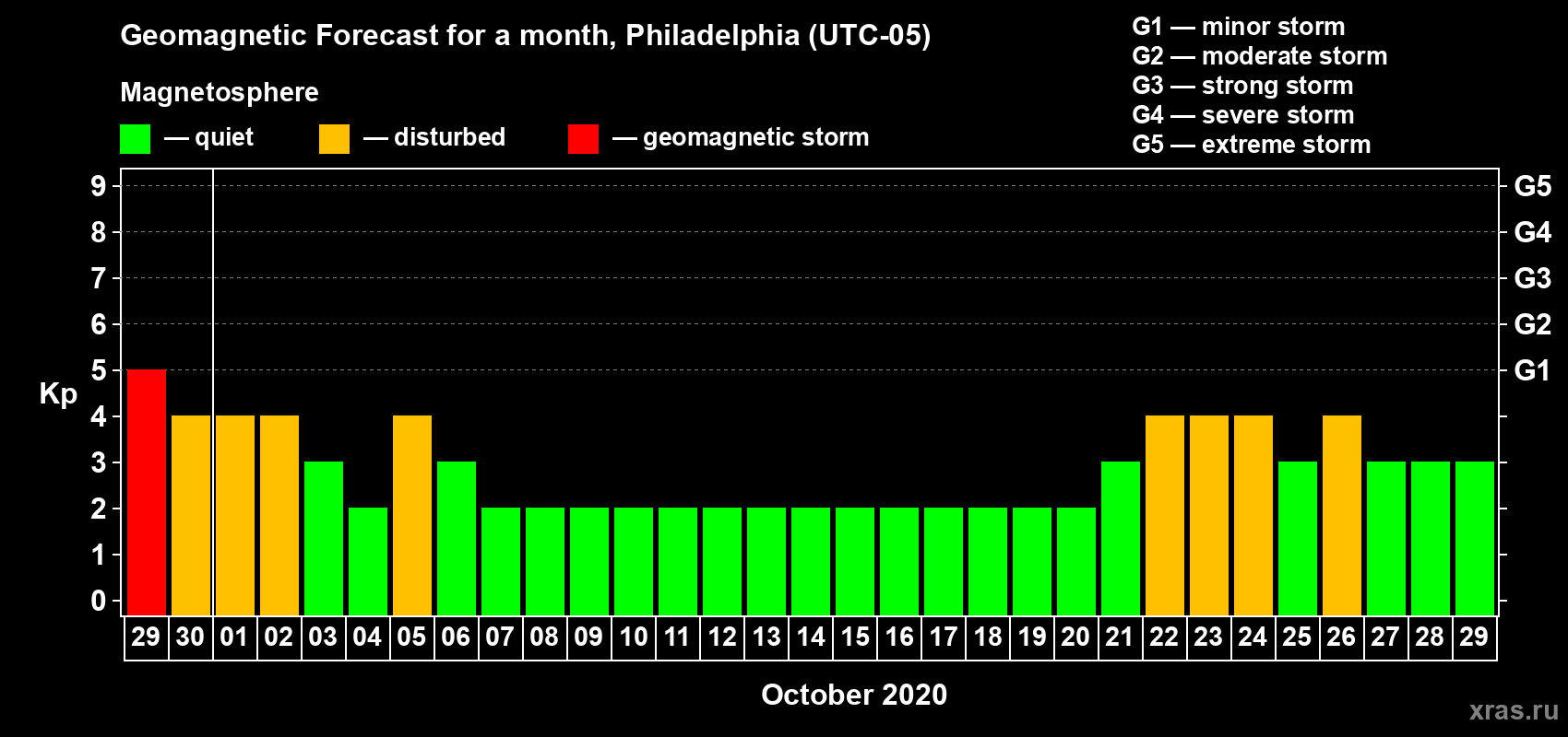 Geomagnetic storm forecast in Philadelphia for Sep 29, 2020