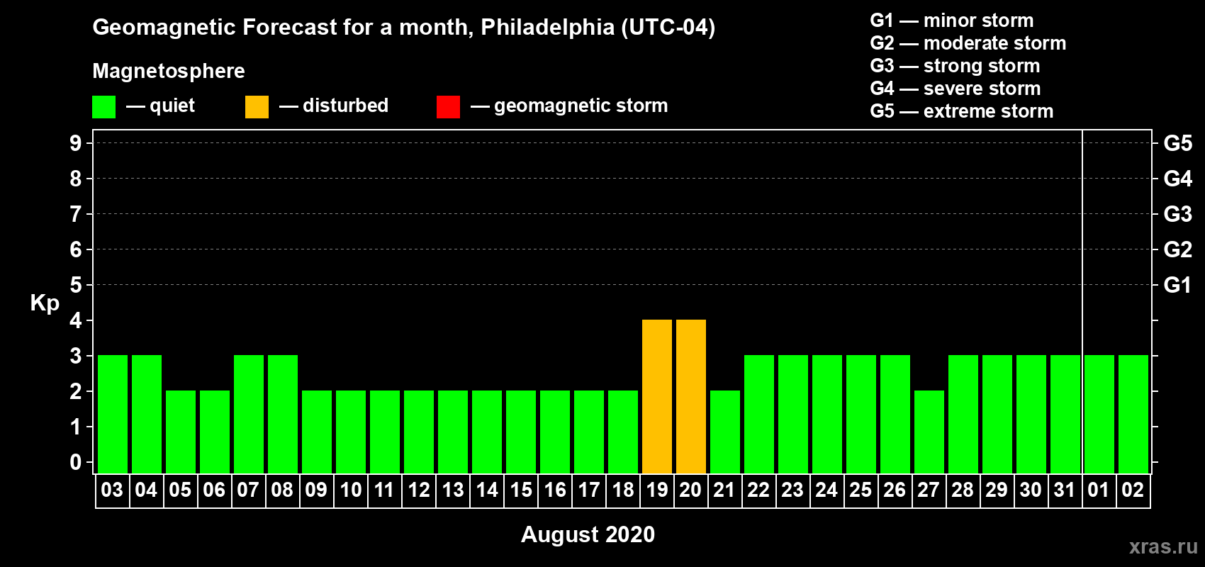 Geomagnetic storm forecast in Philadelphia for Aug 03, 2020