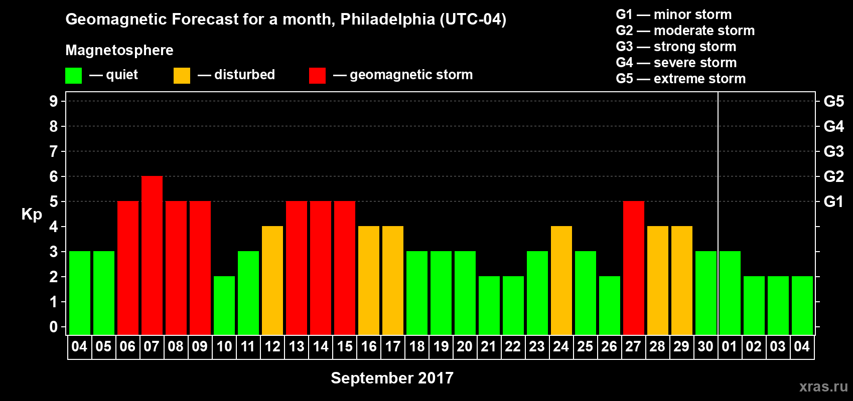Geomagnetic storm forecast in Philadelphia for Sep 04, 2017