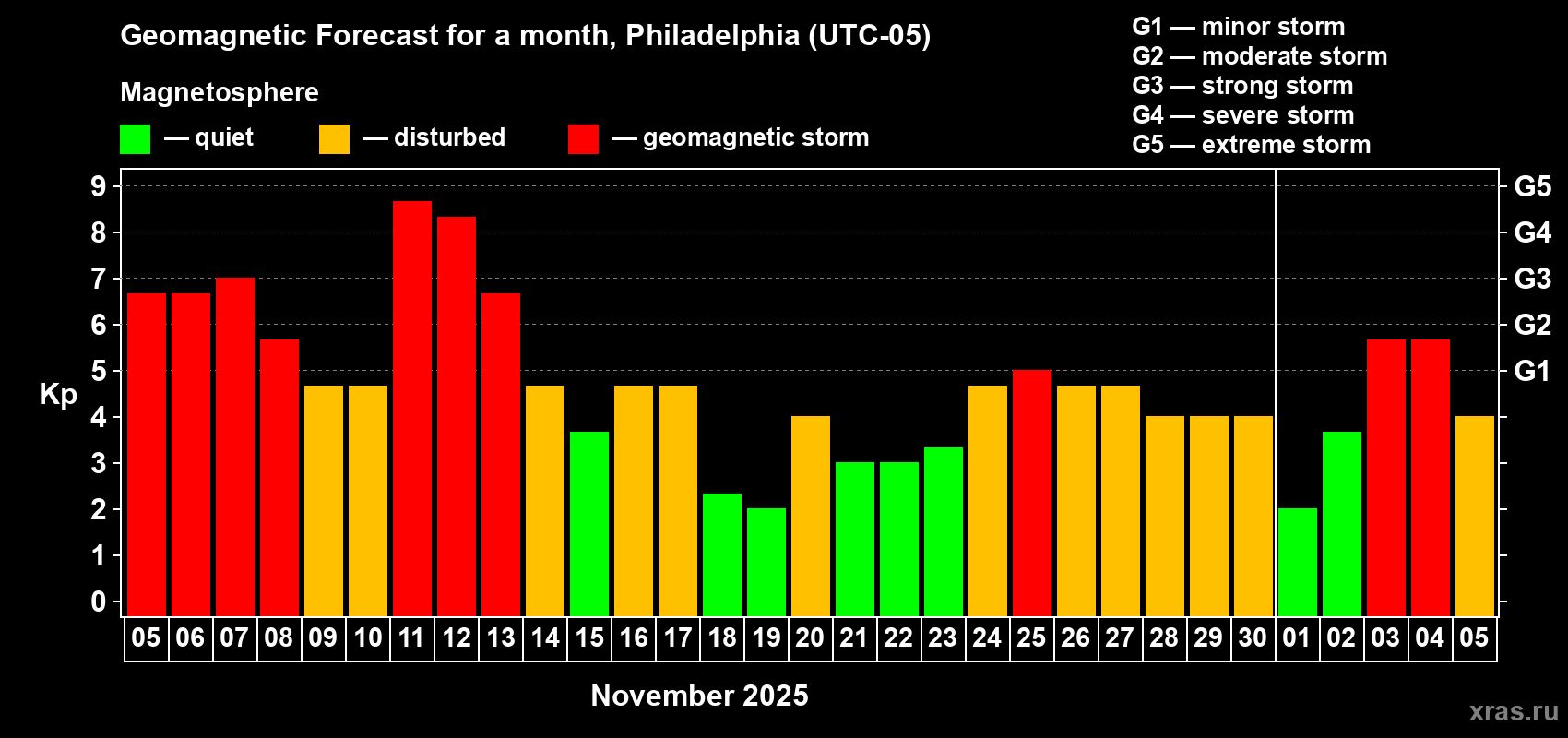 Geomagnetic storm forecast in Philadelphia for Nov 05, 2025
