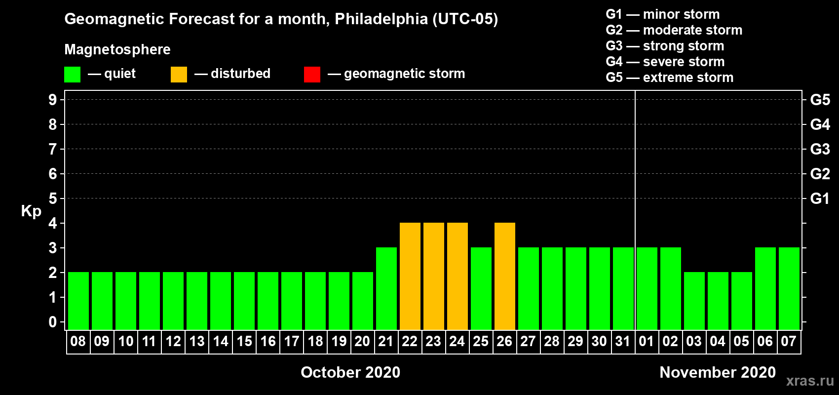 Geomagnetic storm forecast in Philadelphia for Oct 08, 2020