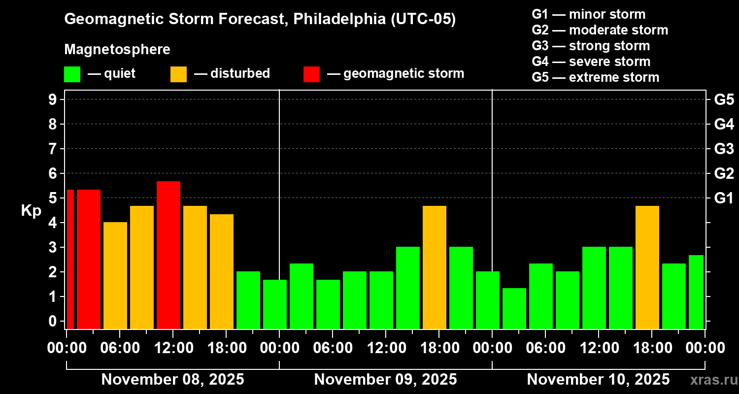 Geomagnetic storm forecast in Philadelphia for Nov 08, 2025