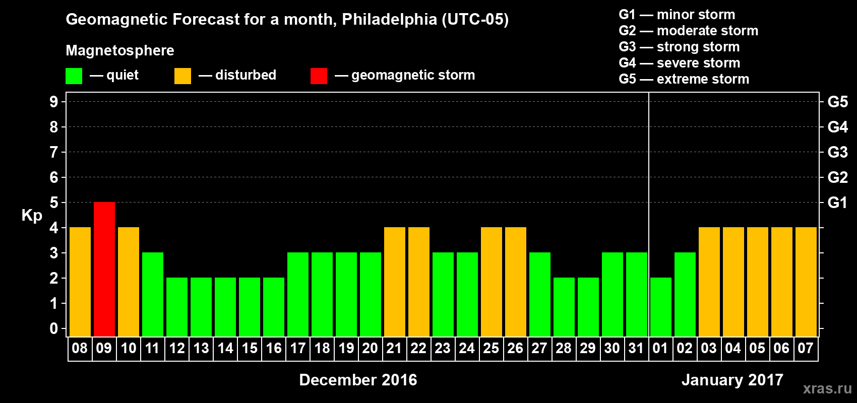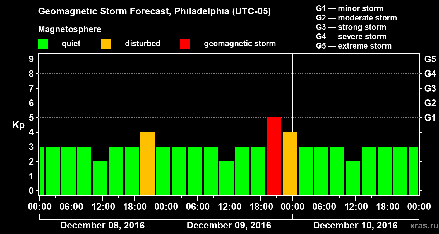 Geomagnetic storm forecast in Philadelphia for Dec 08, 2016