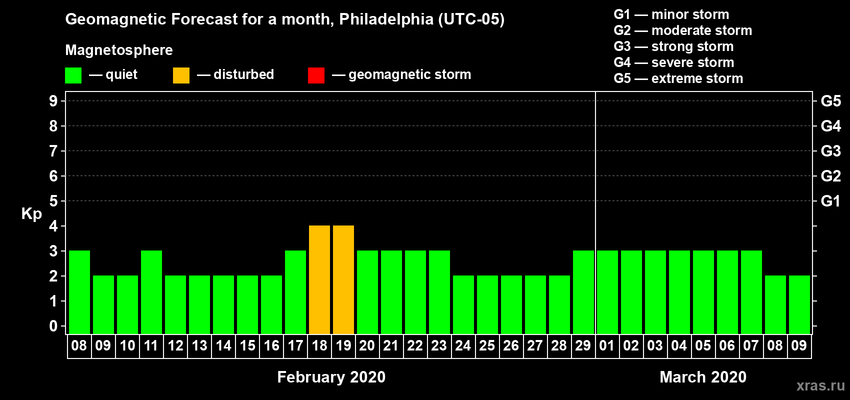 Geomagnetic storm forecast in Philadelphia for Feb 08, 2020