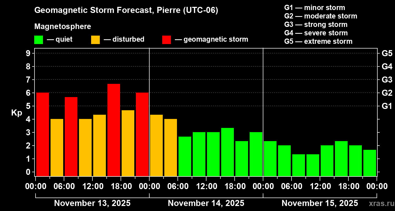 Geomagnetic storm forecast in Pierre for Nov 13, 2025