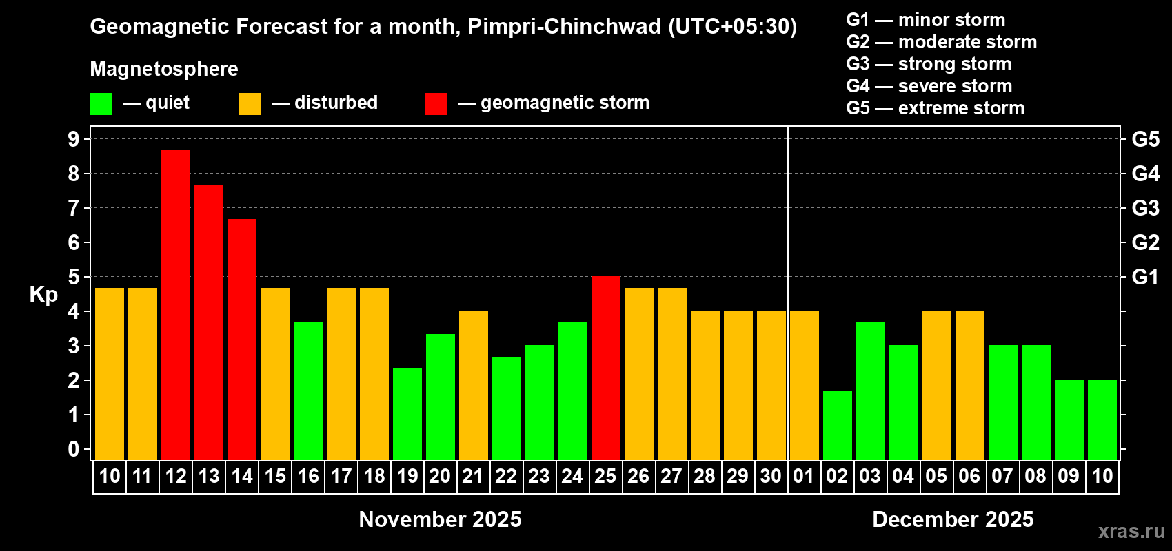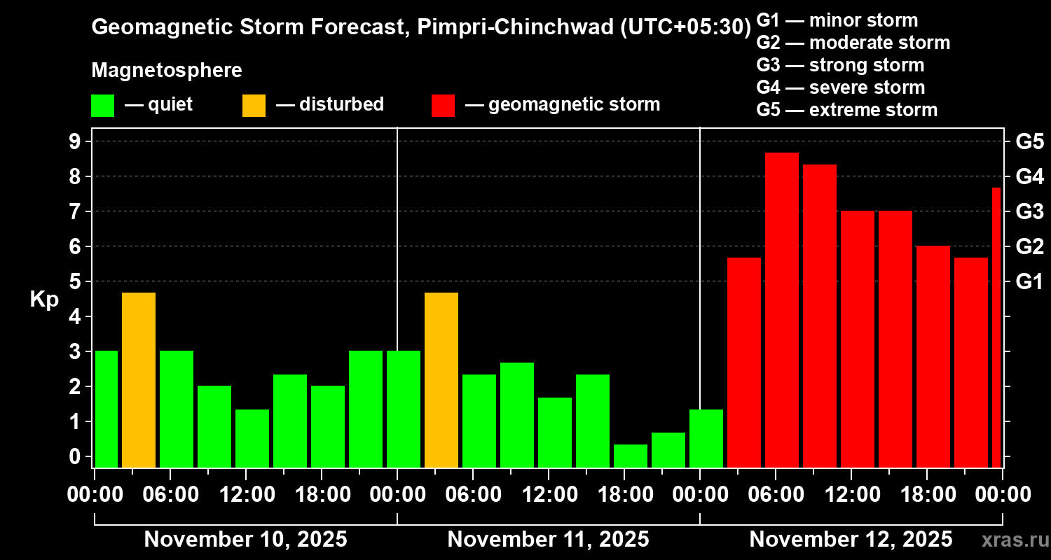 Geomagnetic storm forecast in Pimpri-Chinchwad for Nov 10, 2025