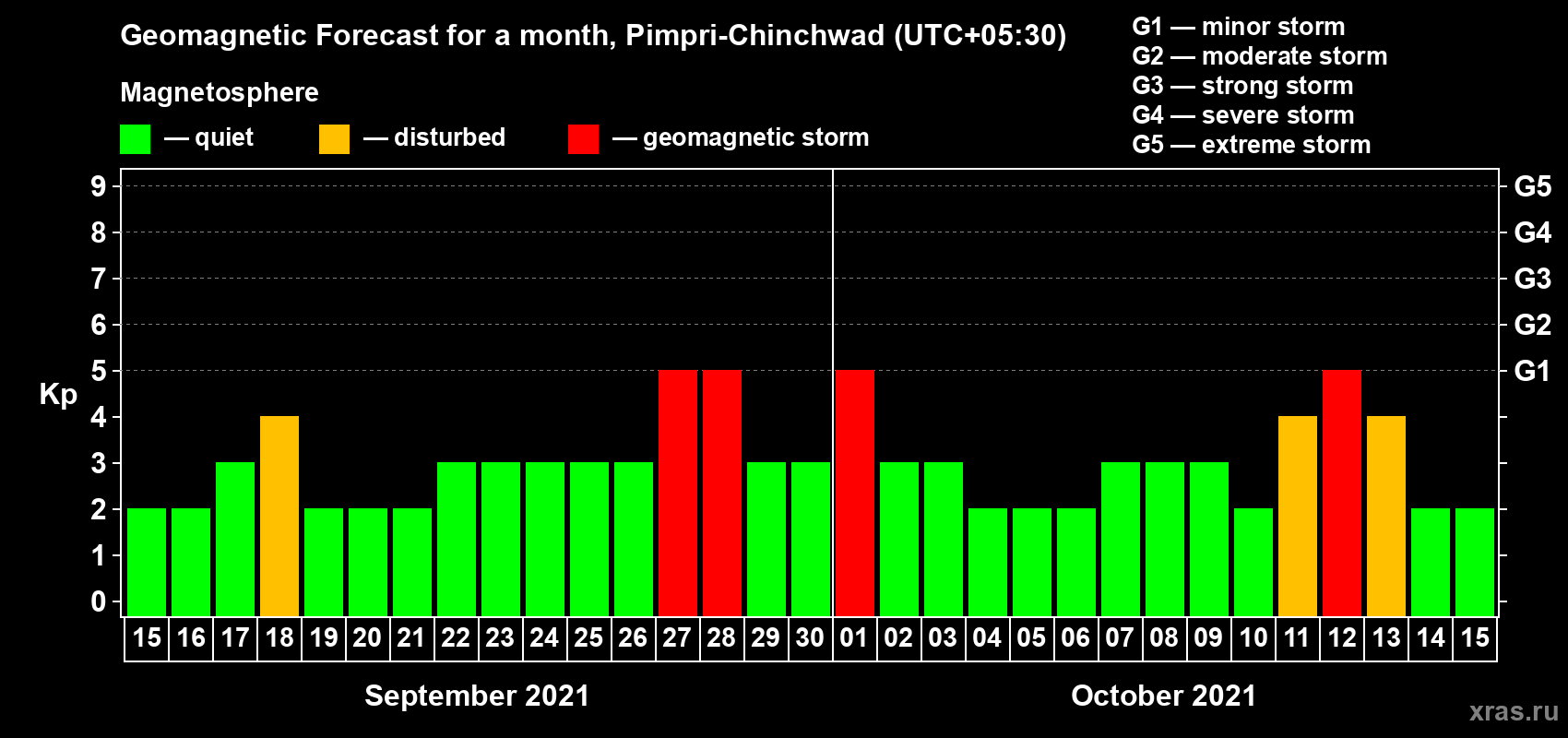 Geomagnetic storm forecast in Pimpri-Chinchwad for Sep 15, 2021