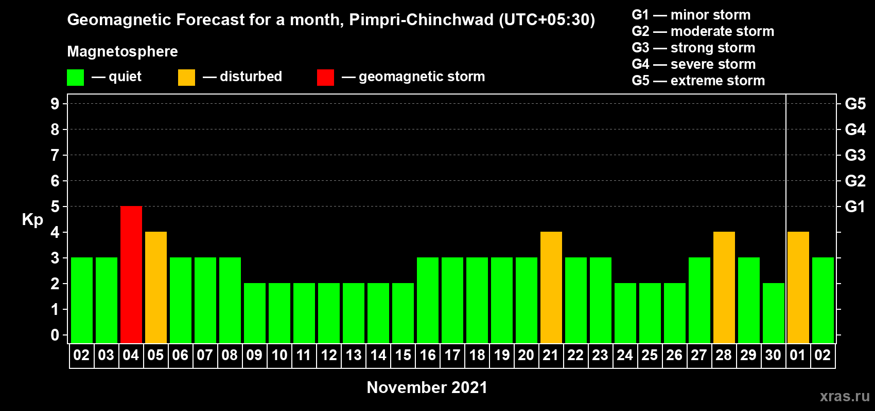 Geomagnetic storm forecast in Pimpri-Chinchwad for Nov 02, 2021