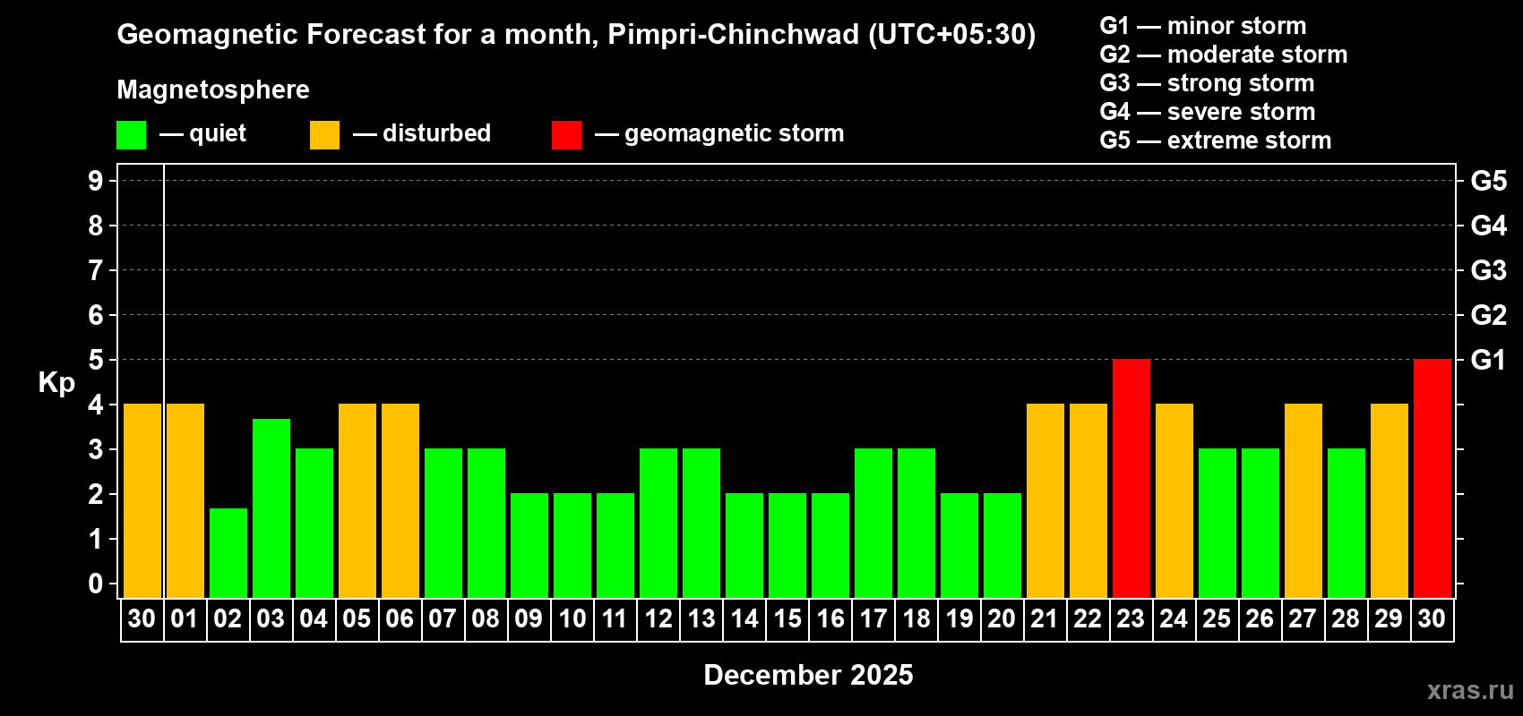 Geomagnetic storm forecast in Pimpri-Chinchwad for Nov 30, 2025