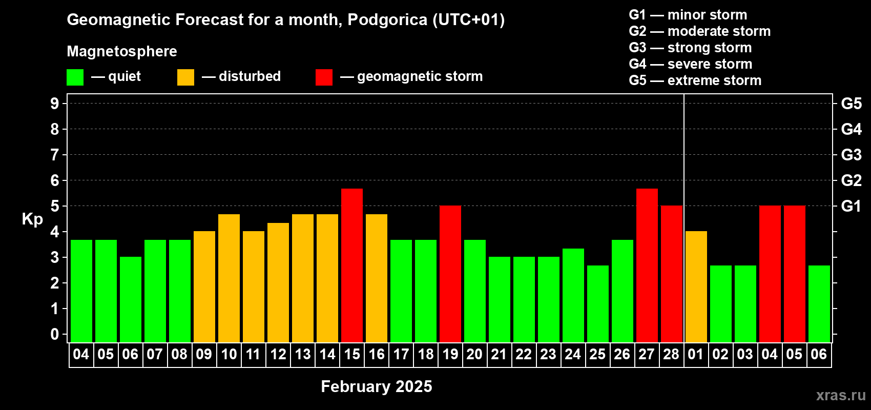 Geomagnetic storm forecast in Podgorica for Feb 04, 2025