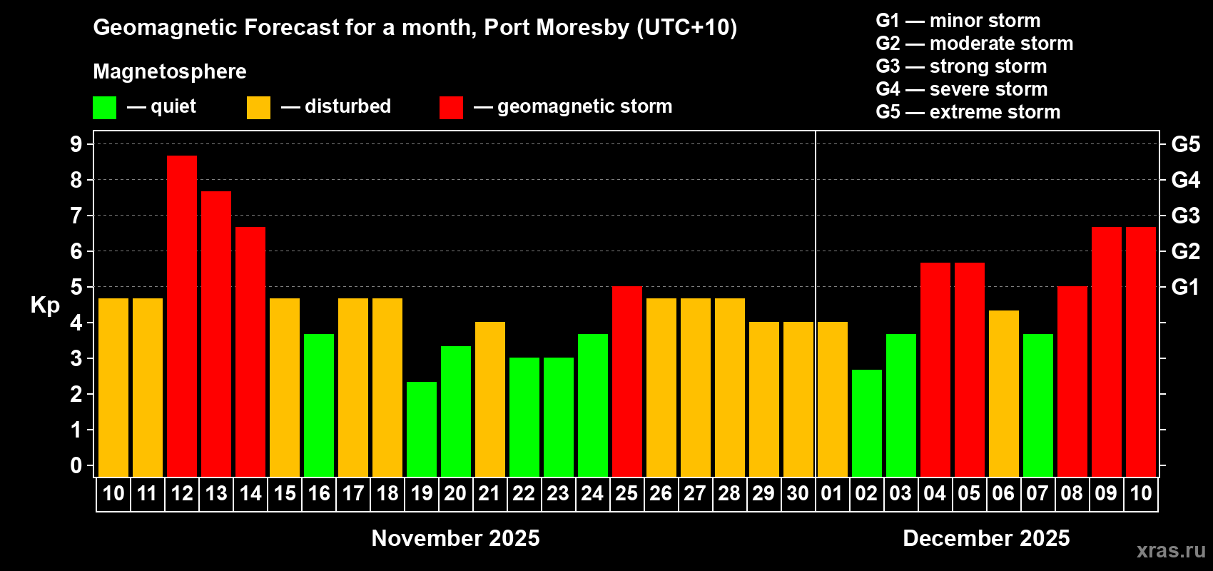 Geomagnetic storm forecast in Port Moresby for Nov 10, 2025