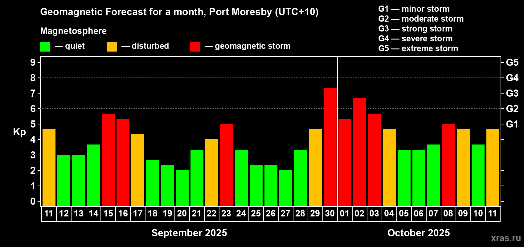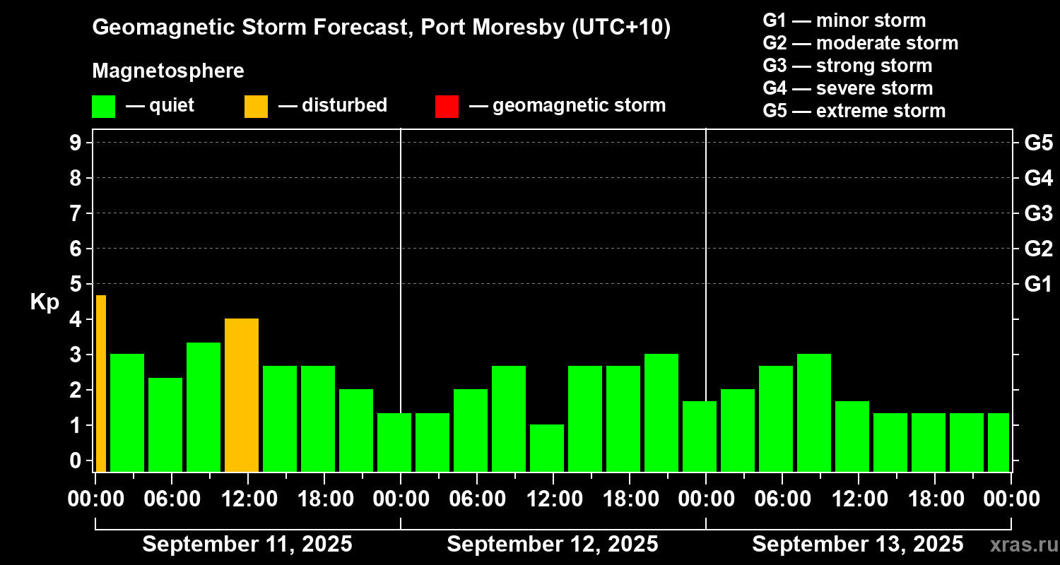 Geomagnetic storm forecast in Port Moresby for Sep 11, 2025