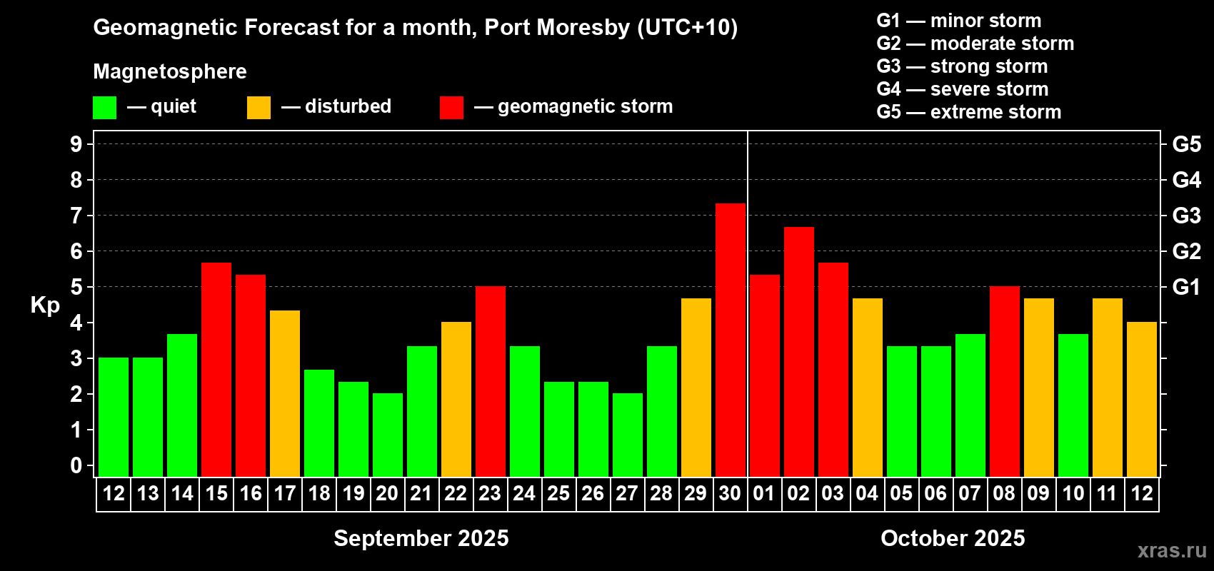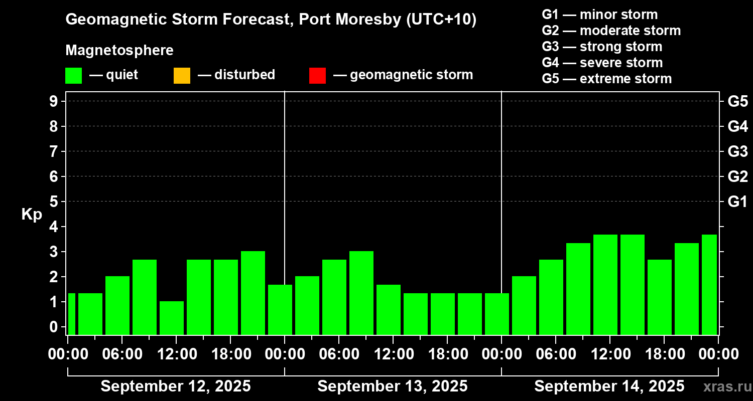 Geomagnetic storm forecast in Port Moresby for Sep 12, 2025