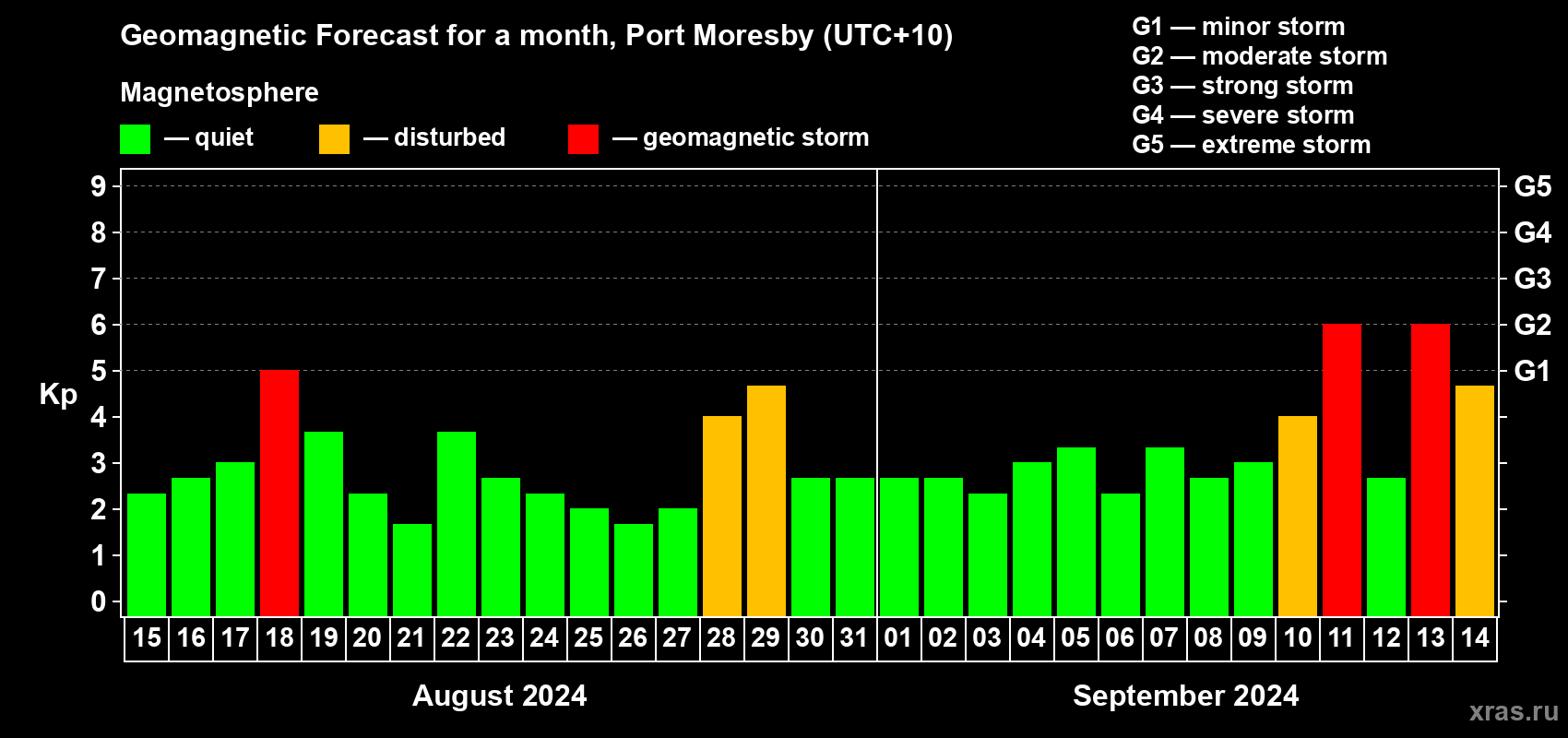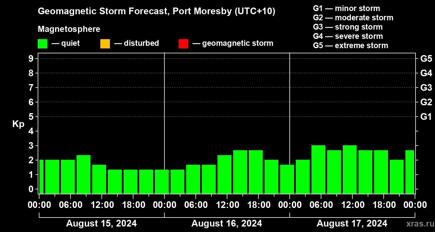 Geomagnetic storm forecast in Port Moresby for Aug 15, 2024