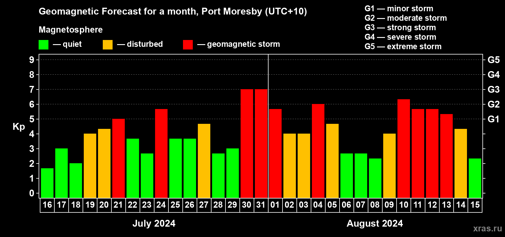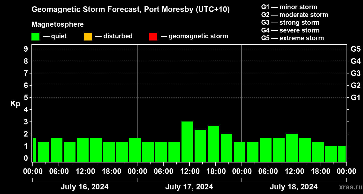 Geomagnetic storm forecast in Port Moresby for Jul 16, 2024