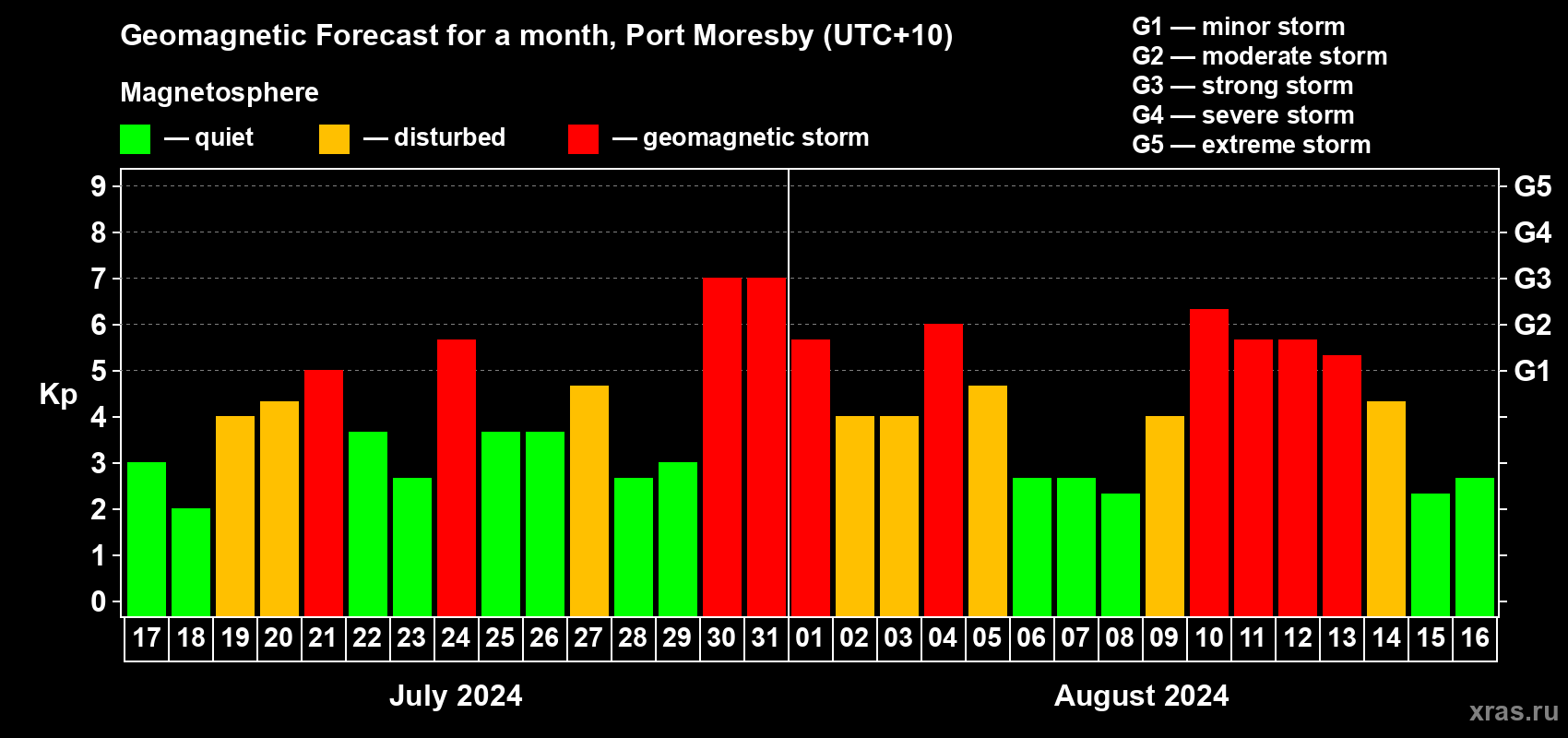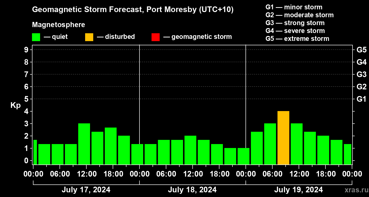 Geomagnetic storm forecast in Port Moresby for Jul 17, 2024