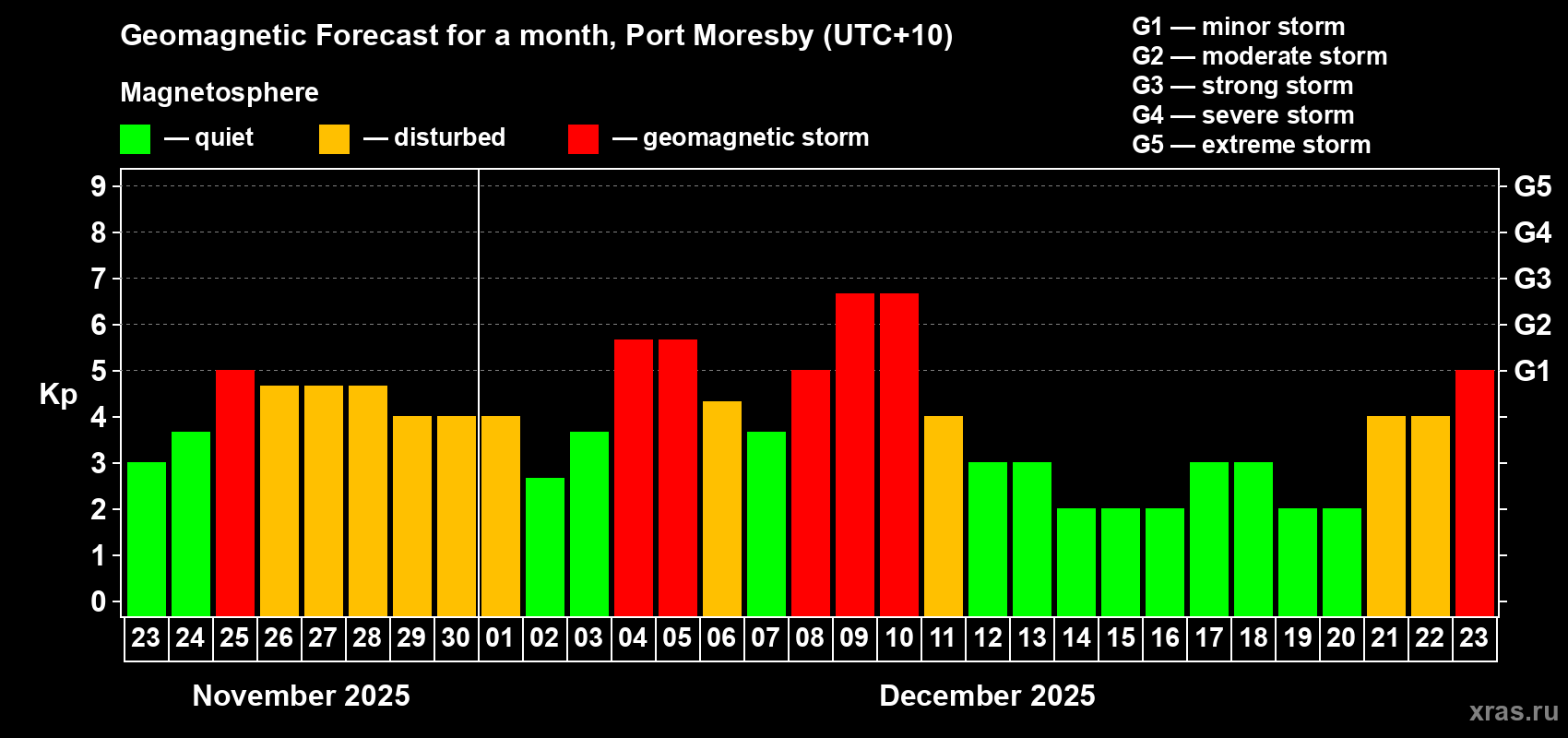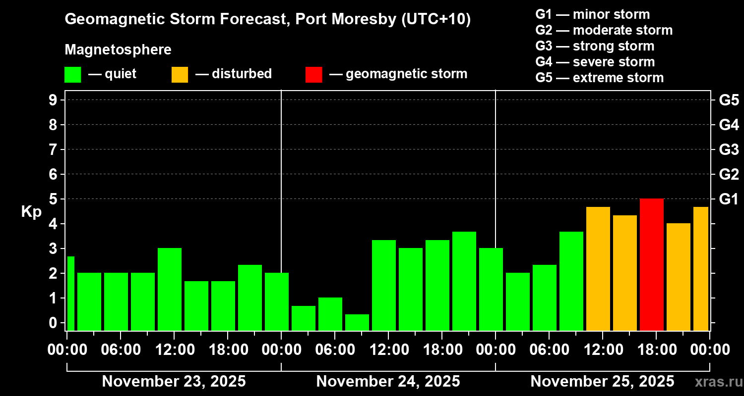 Geomagnetic storm forecast in Port Moresby for Nov 23, 2025