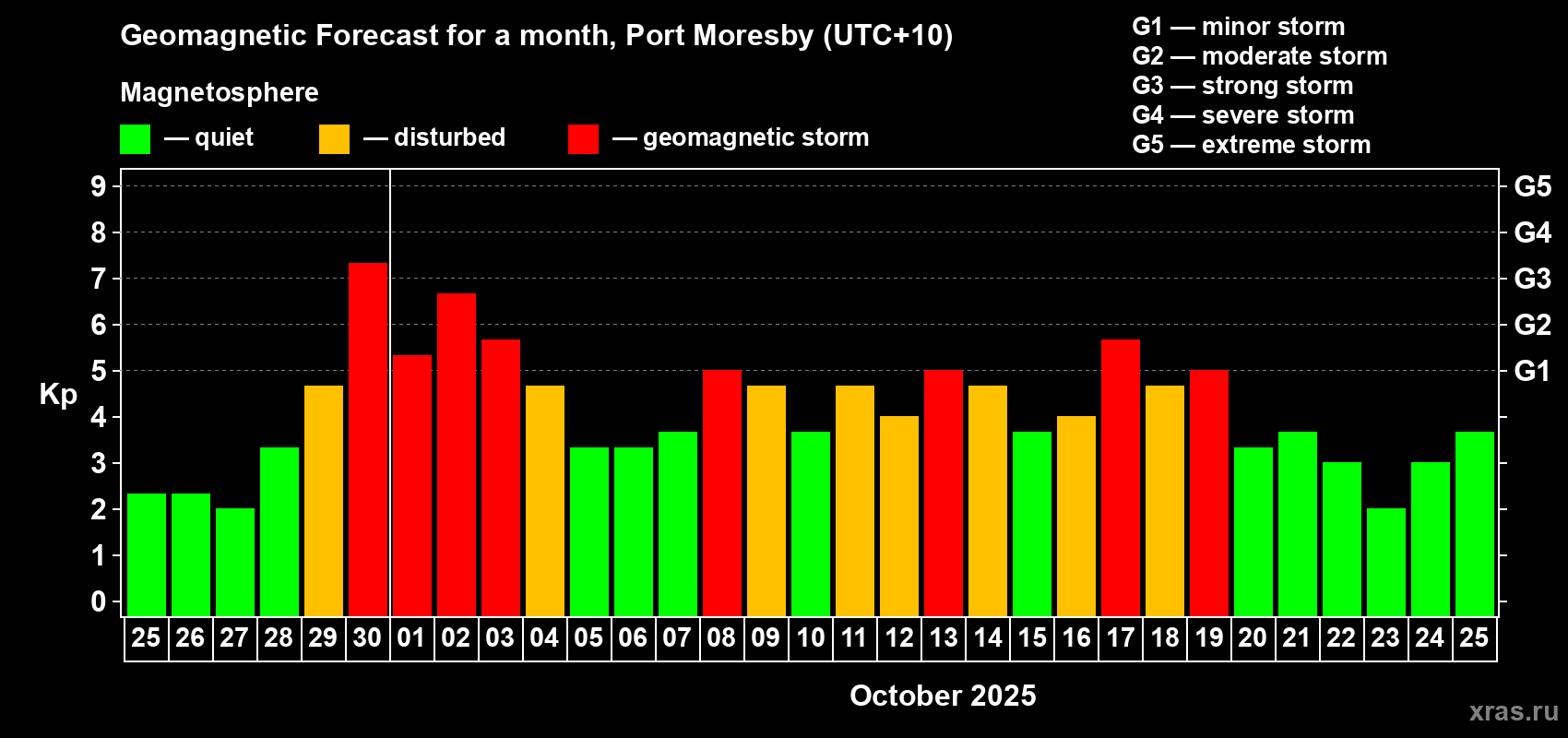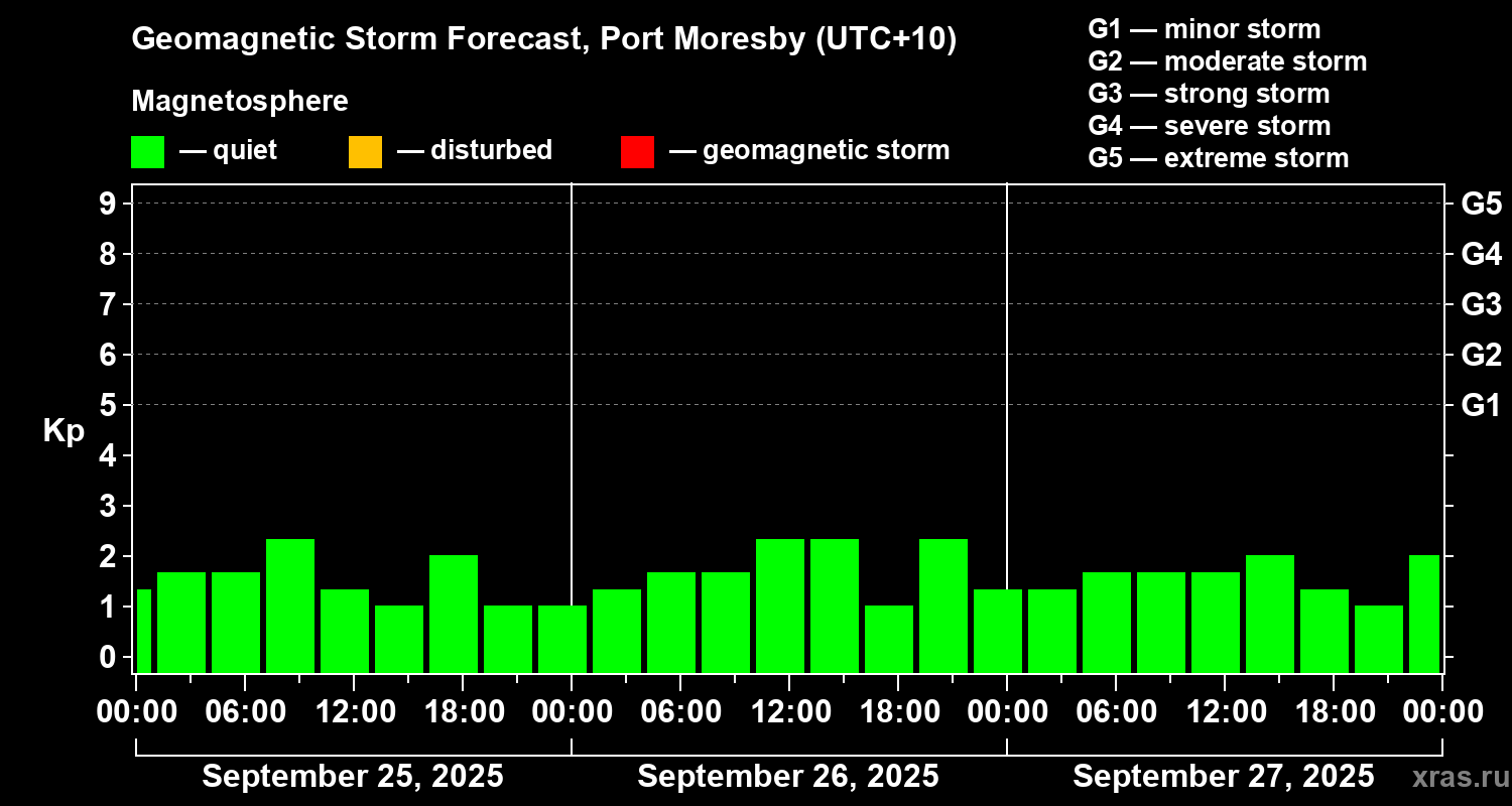 Geomagnetic storm forecast in Port Moresby for Sep 25, 2025