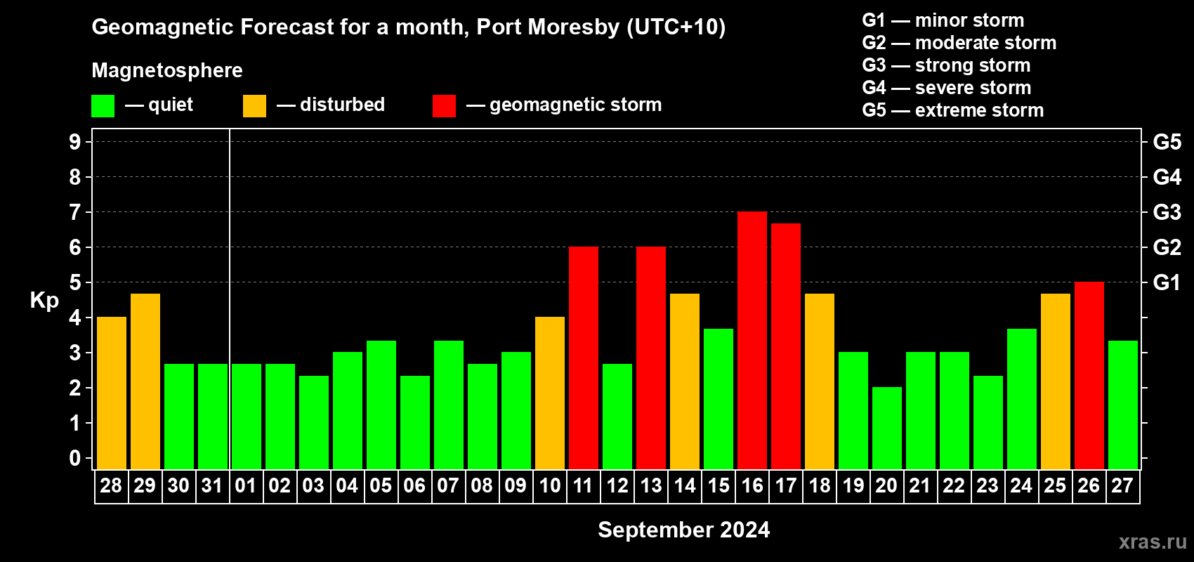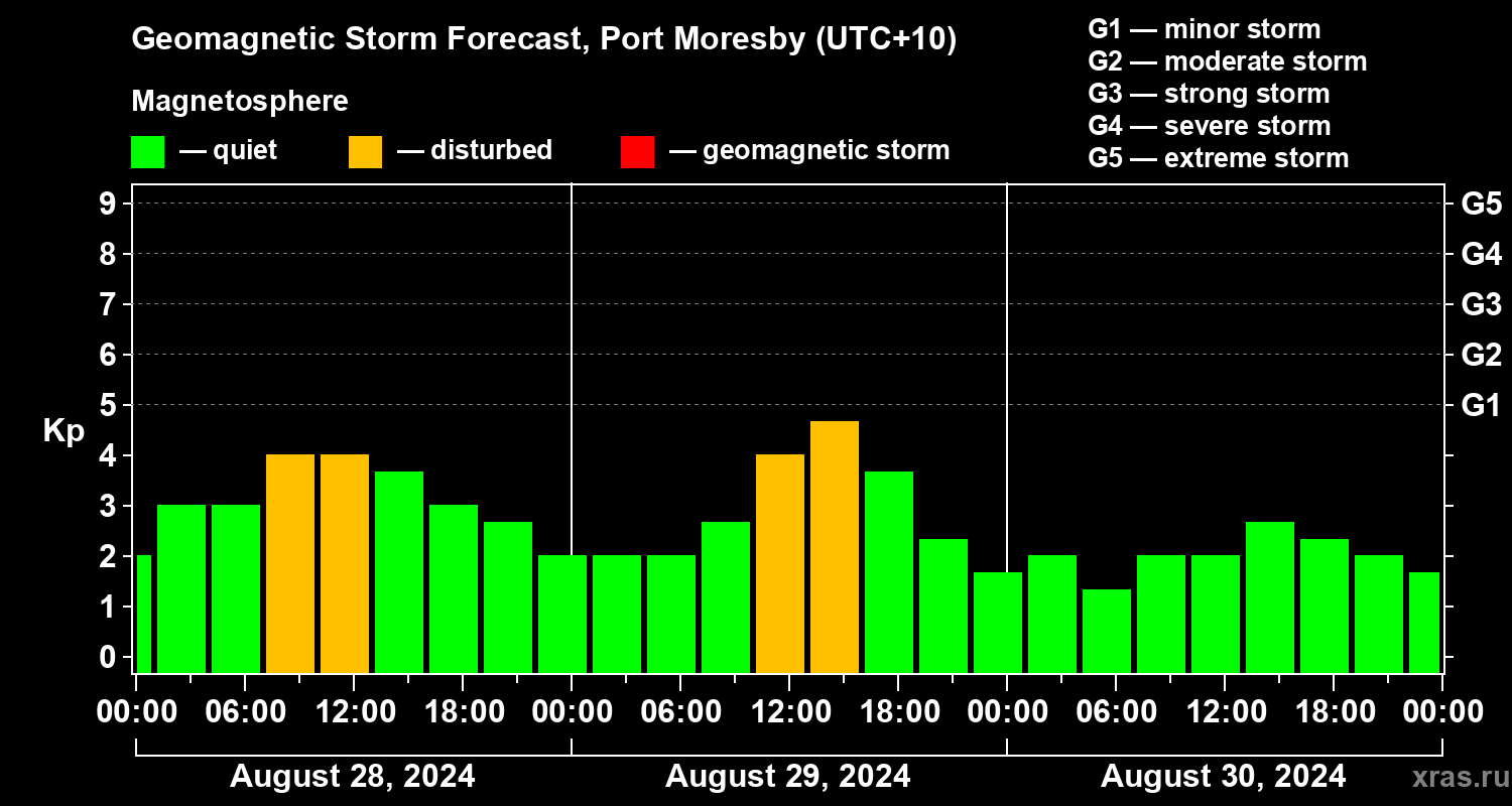 Geomagnetic storm forecast in Port Moresby for Aug 28, 2024