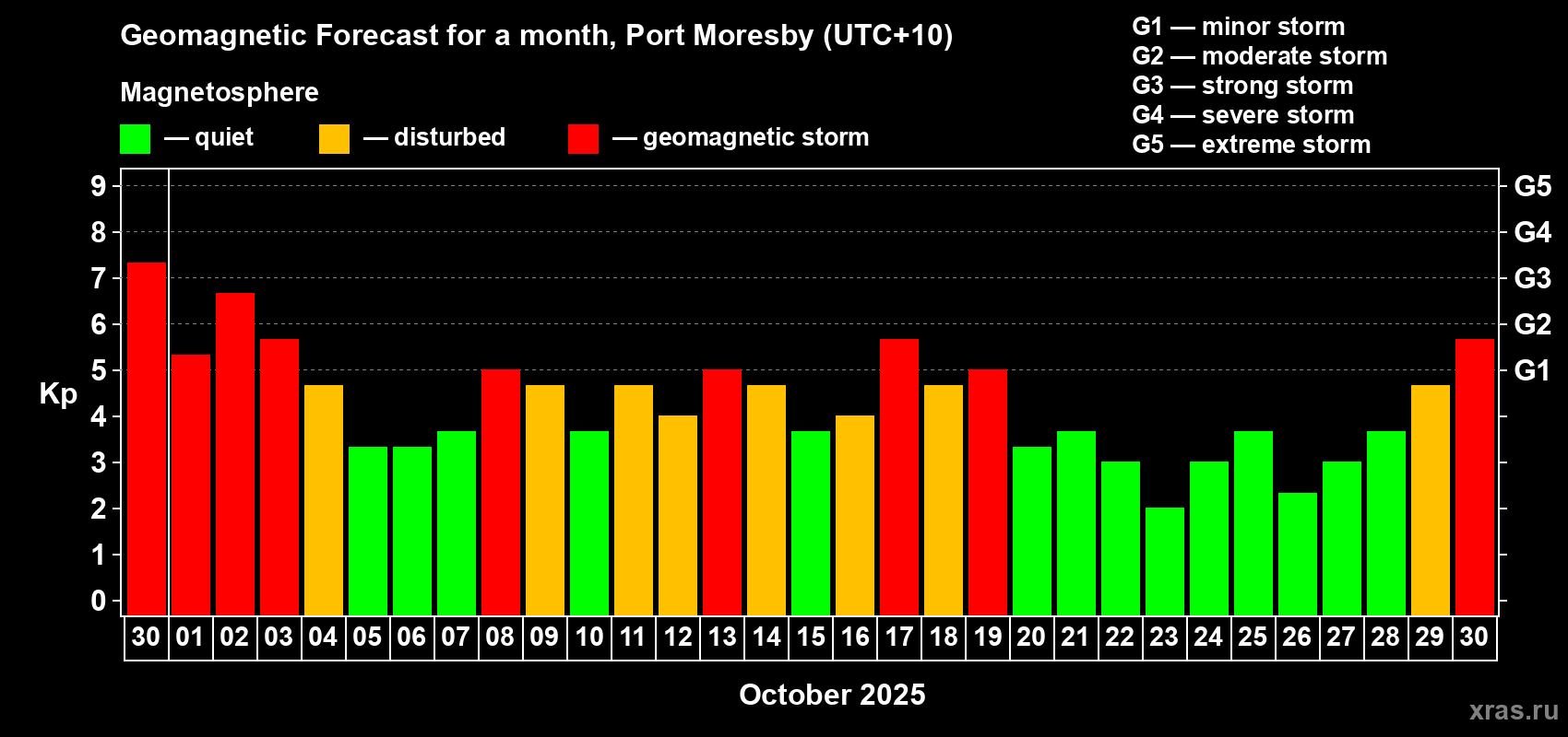 Geomagnetic storm forecast in Port Moresby for Sep 30, 2025