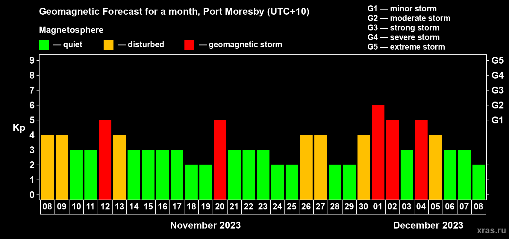 Geomagnetic storm forecast in Port Moresby for Nov 08, 2023