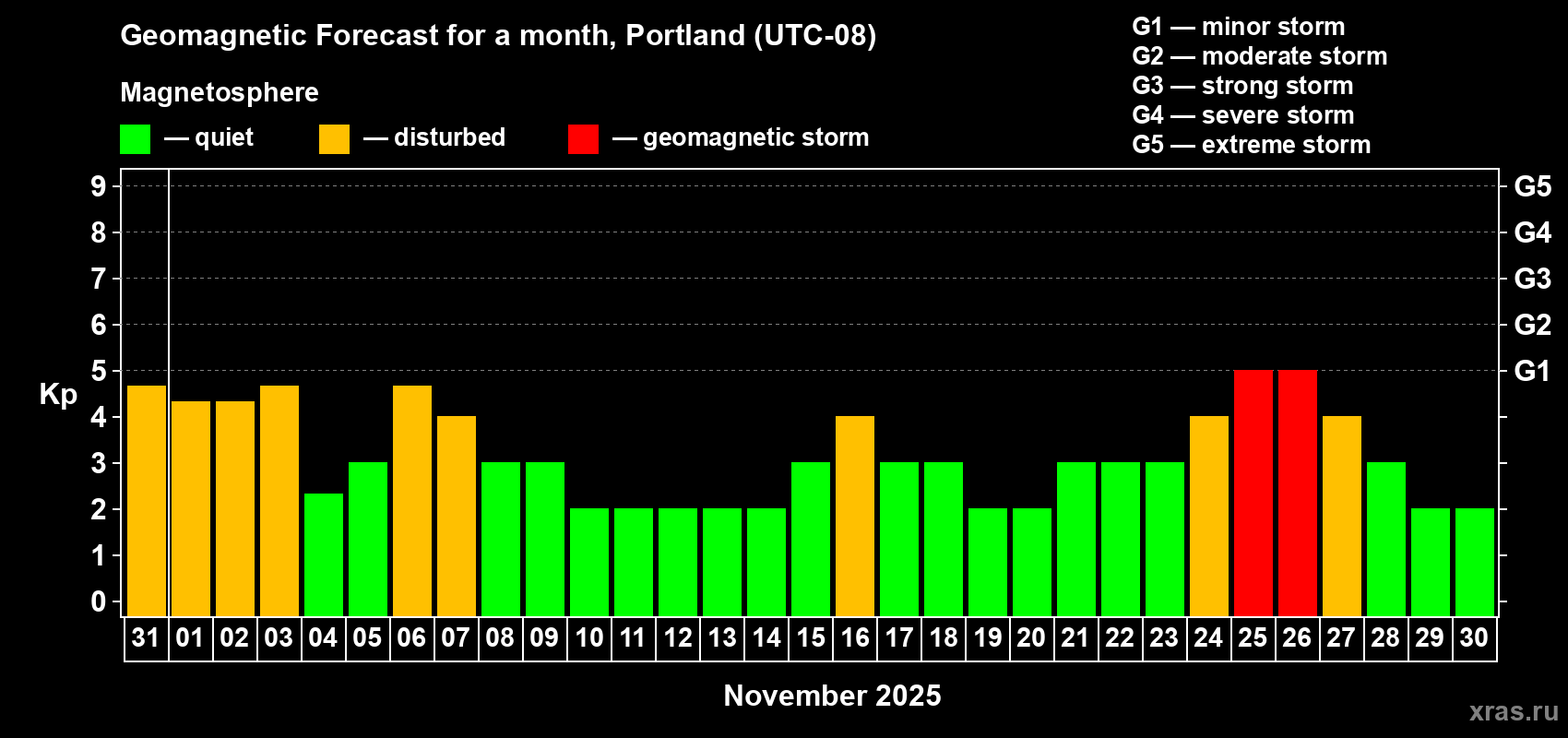 Geomagnetic storm forecast in Portland for Oct 31, 2025