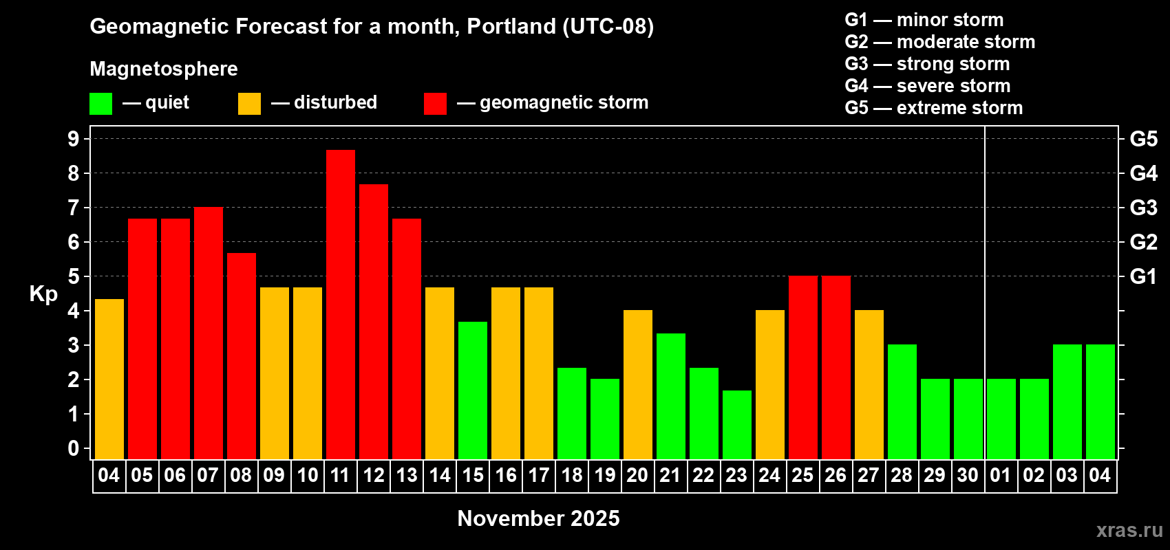 Geomagnetic storm forecast in Portland for Nov 04, 2025