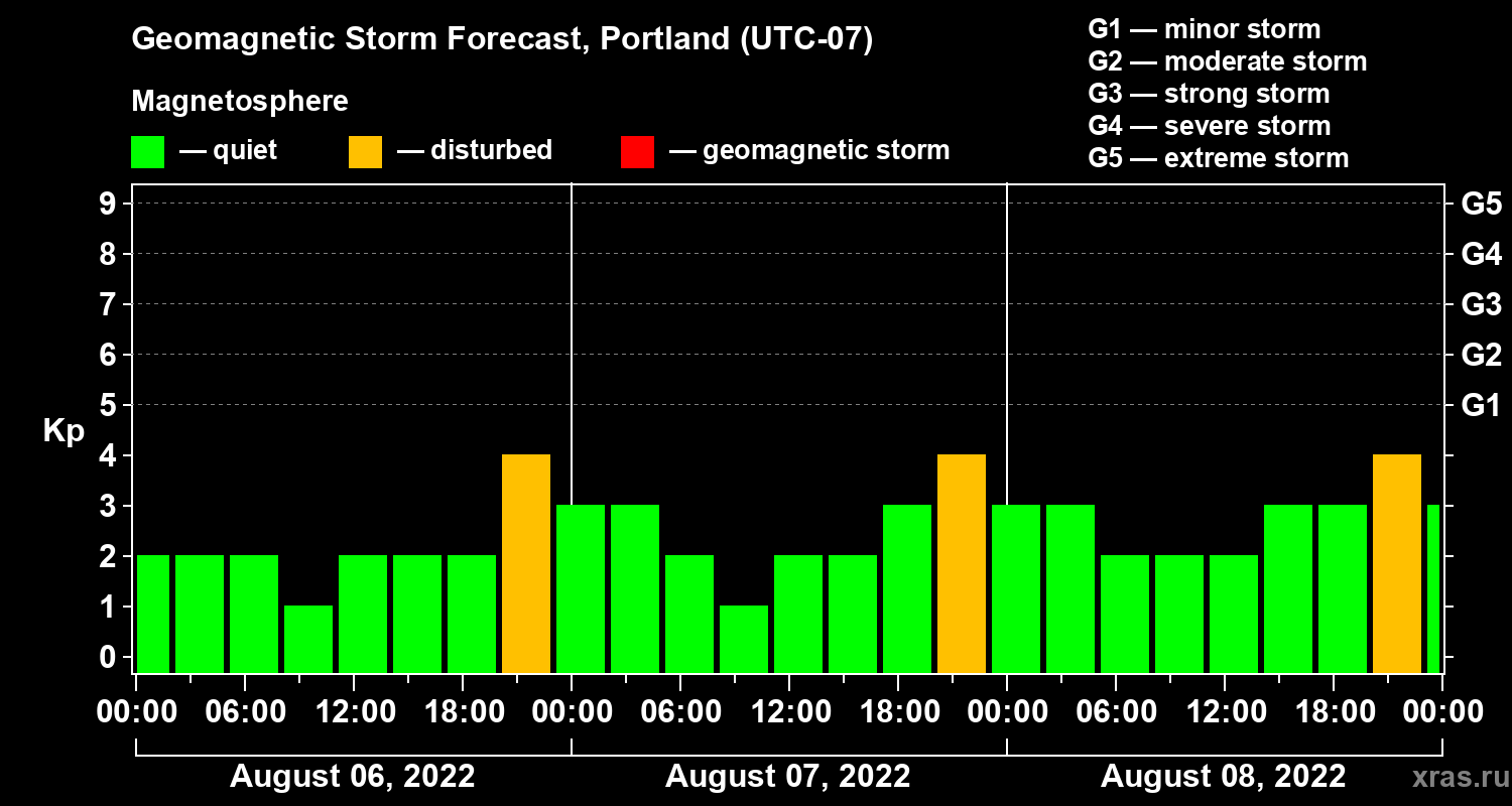 Geomagnetic storm forecast in Portland for Aug 06, 2022