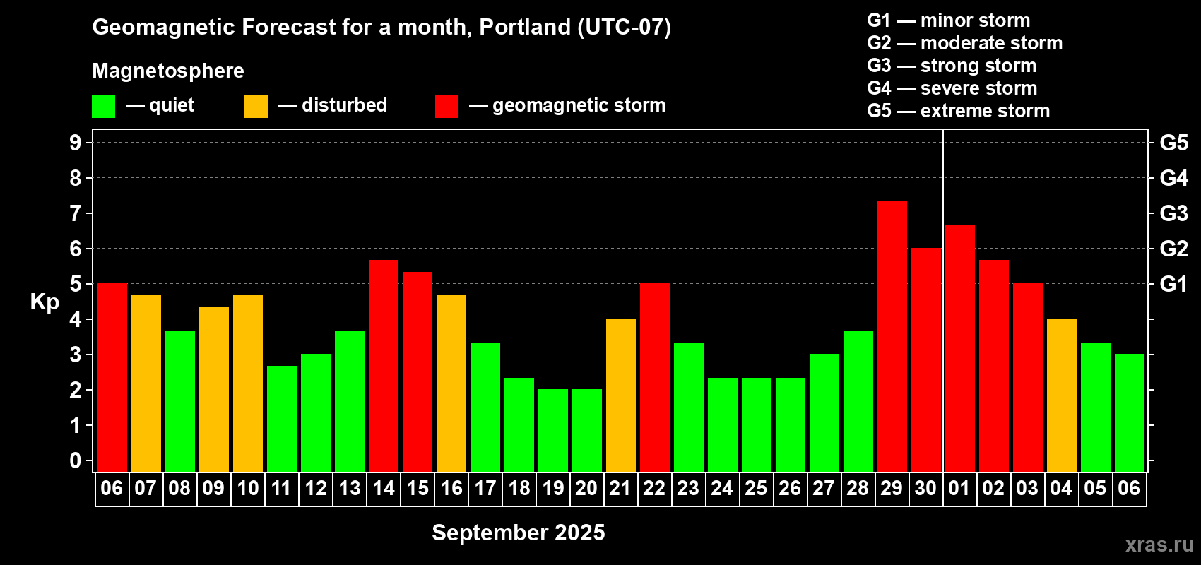 Geomagnetic storm forecast in Portland for Sep 06, 2025