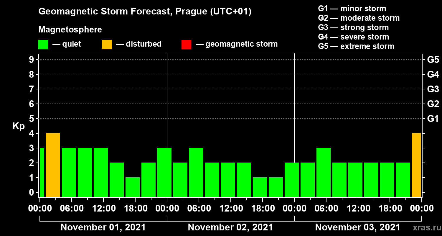 Geomagnetic storm forecast in Prague for Nov 01, 2021