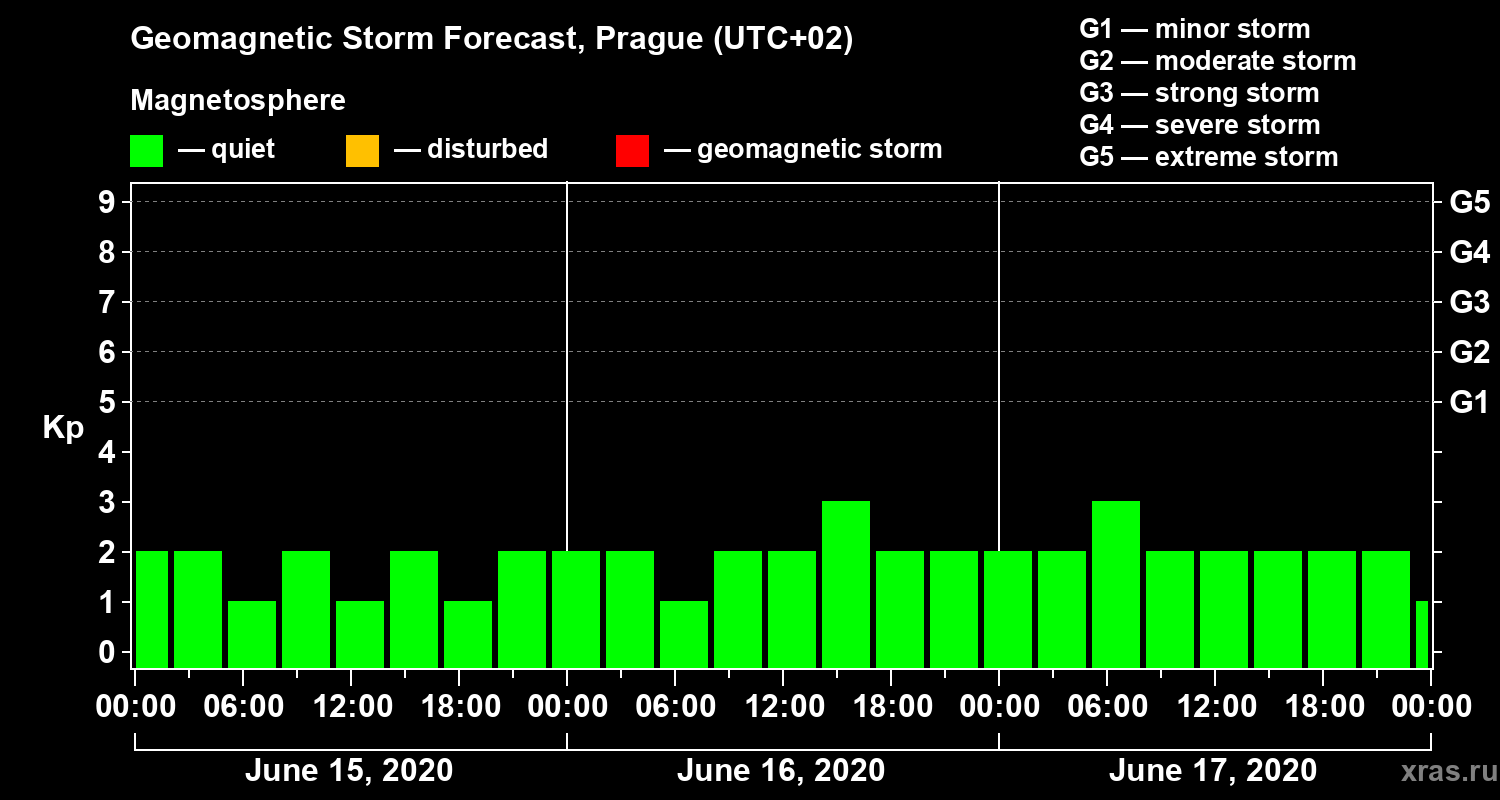Geomagnetic storm forecast in Prague for Jun 15, 2020