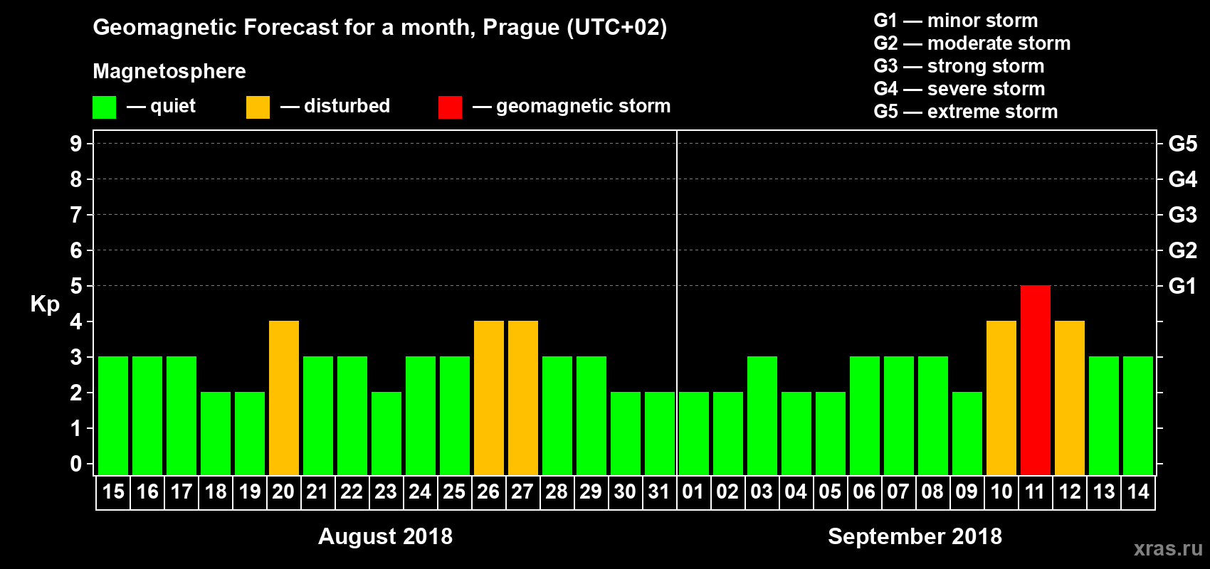 Geomagnetic storm forecast in Prague for Aug 15, 2018