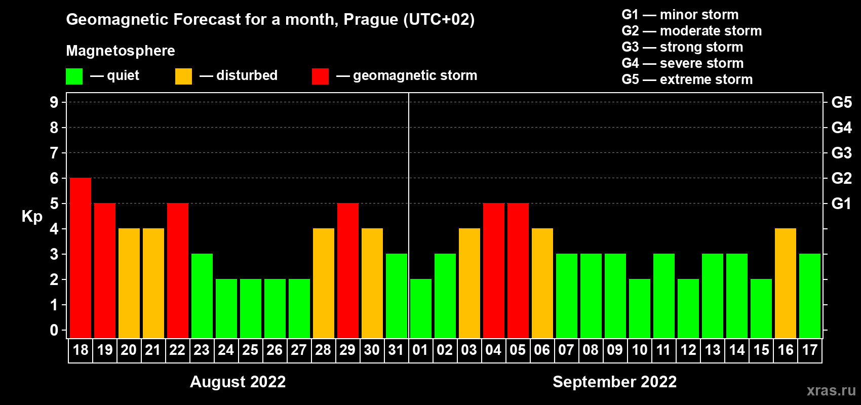 Geomagnetic storm forecast in Prague for Aug 18, 2022