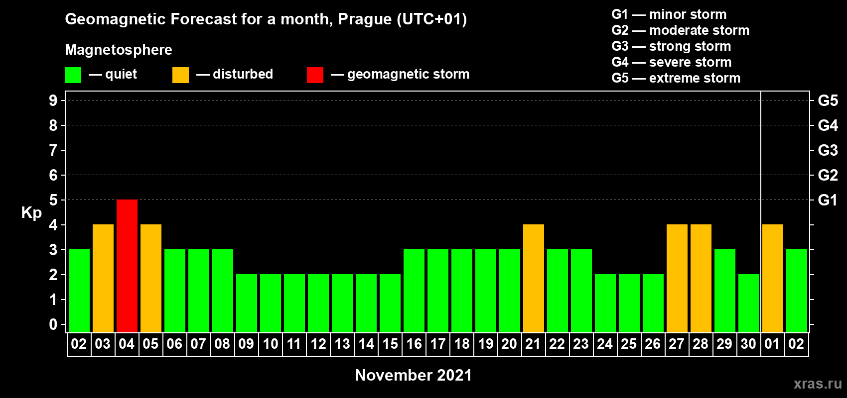Geomagnetic storm forecast in Prague for Nov 02, 2021
