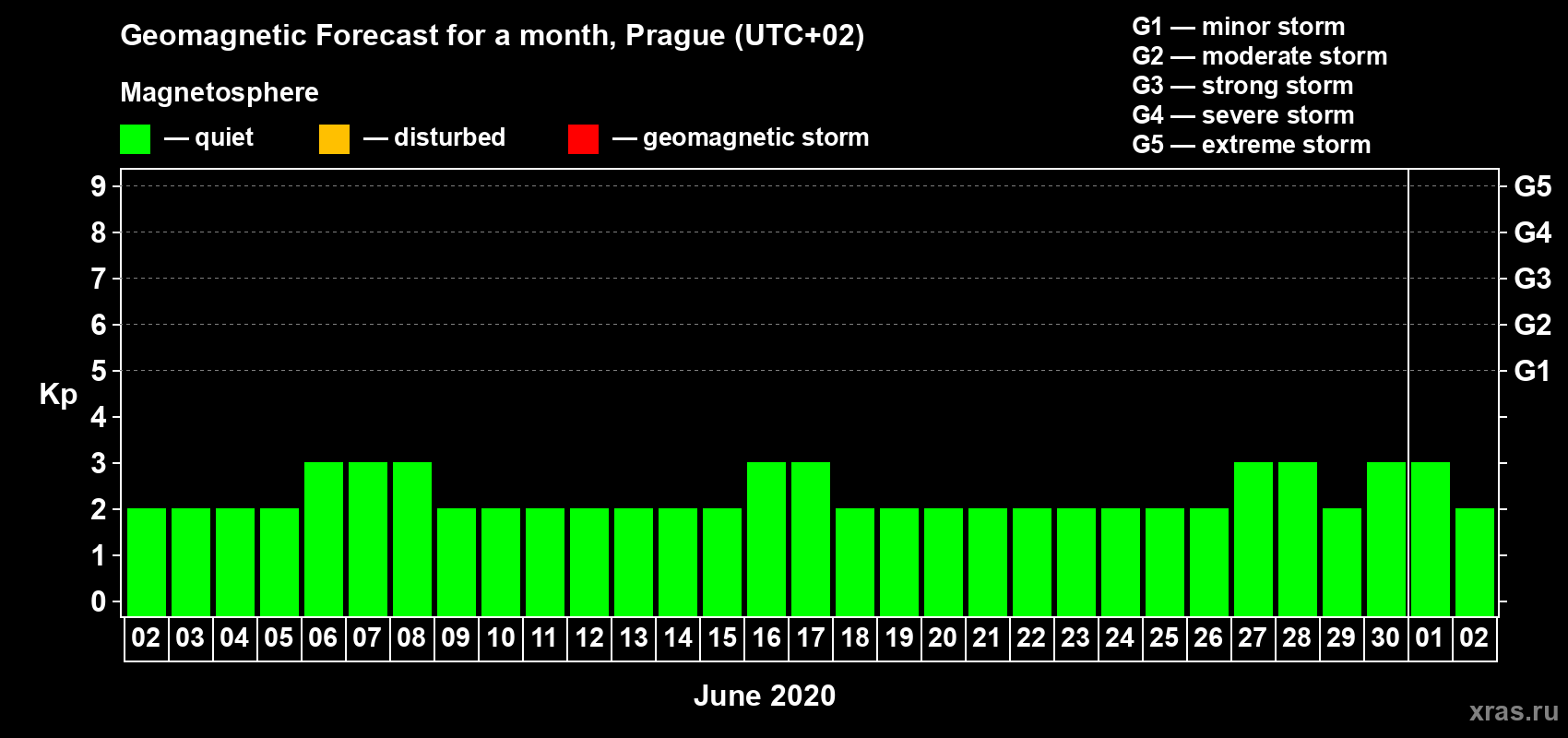 Geomagnetic storm forecast in Prague for Jun 02, 2020