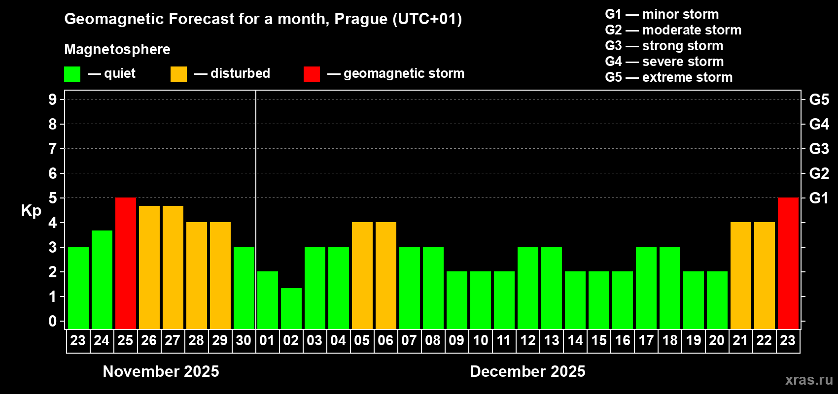 Geomagnetic storm forecast in Prague for Nov 23, 2025
