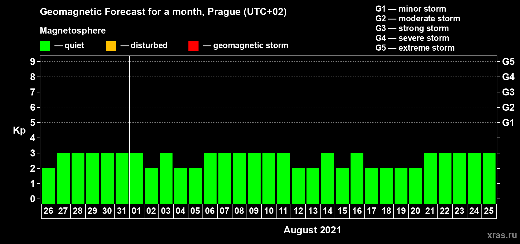 Geomagnetic storm forecast in Prague for Jul 26, 2021