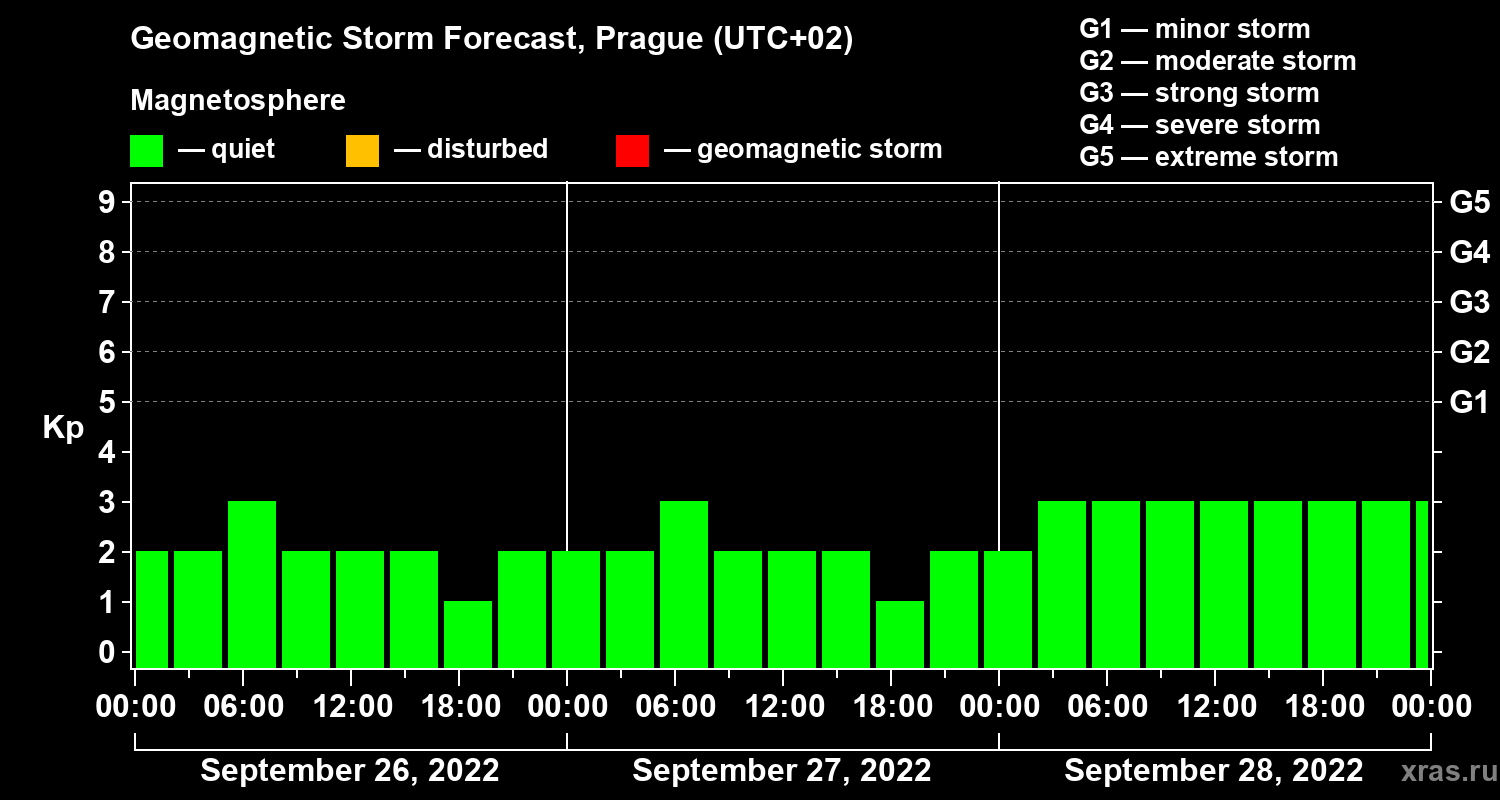 Geomagnetic storm forecast in Prague for Sep 26, 2022