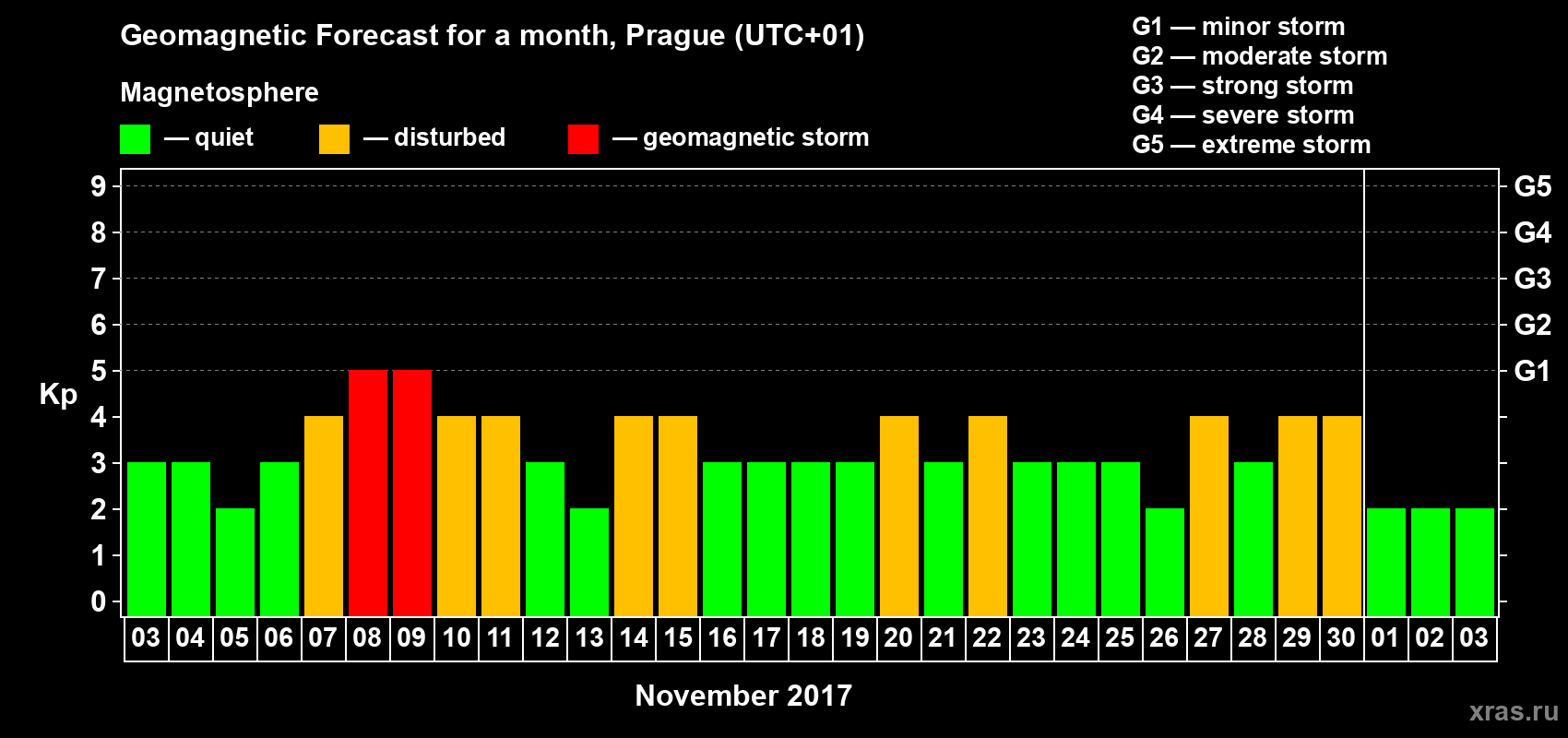 Geomagnetic storm forecast in Prague for Nov 03, 2017