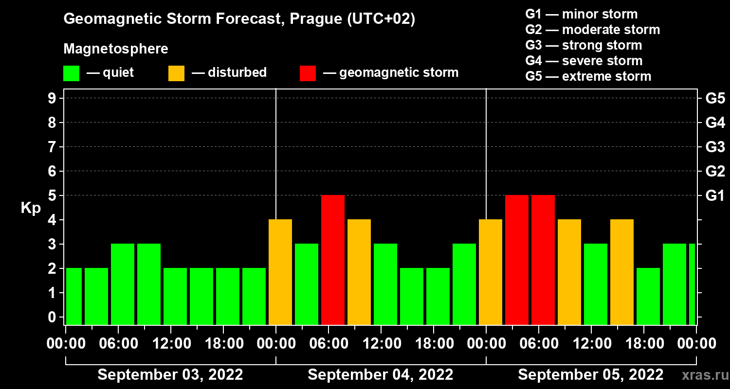 Geomagnetic storm forecast in Prague for Sep 03, 2022