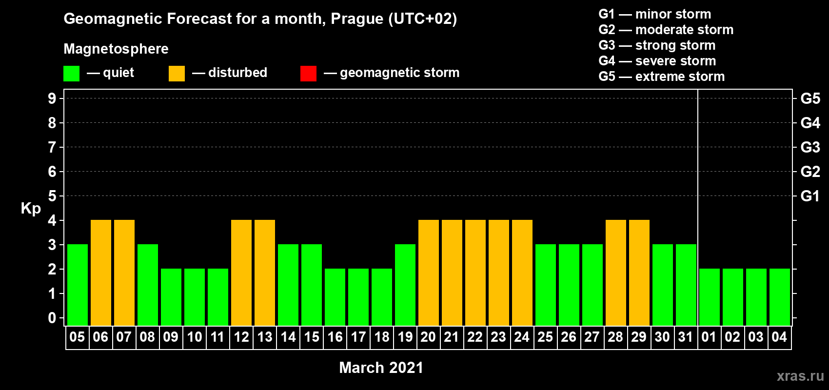 Geomagnetic storm forecast in Prague for Mar 05, 2021