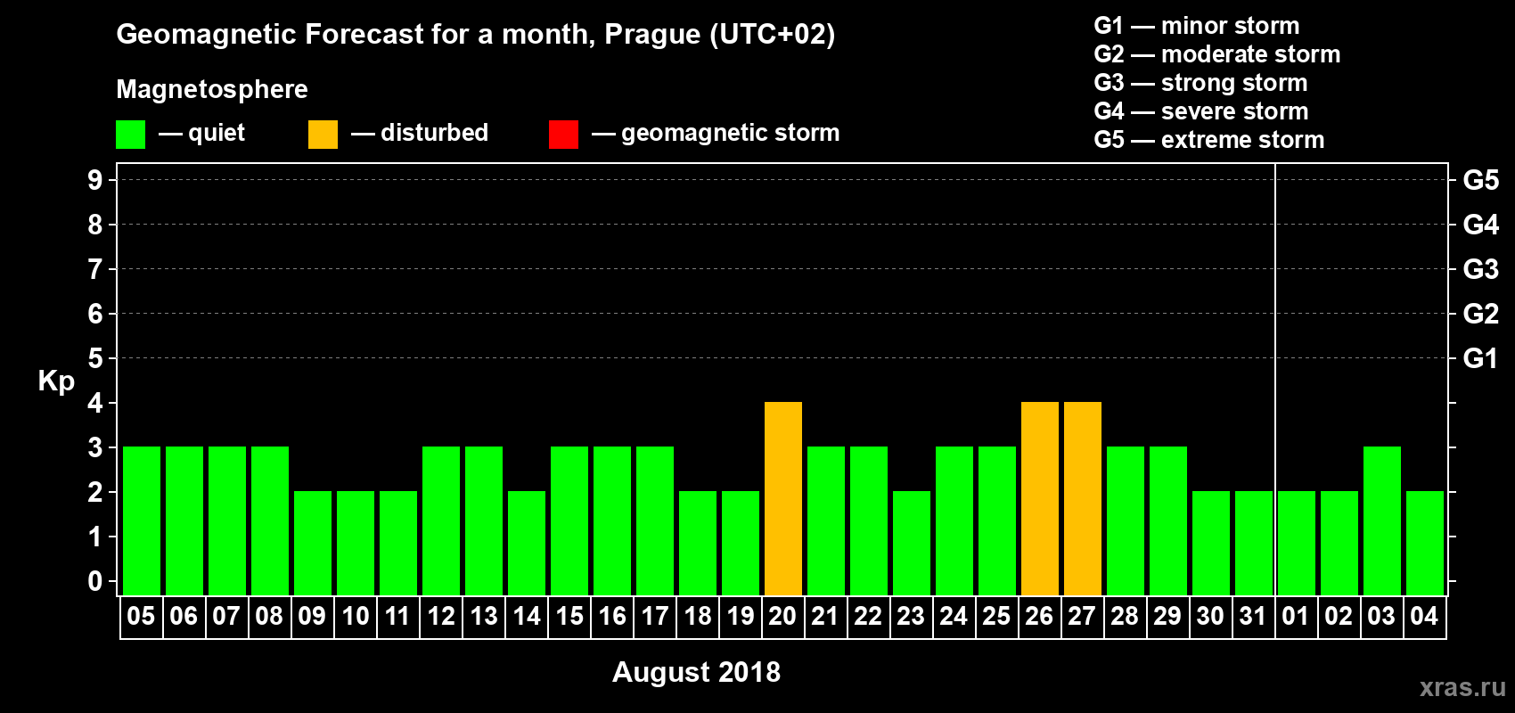 Geomagnetic storm forecast in Prague for Aug 05, 2018