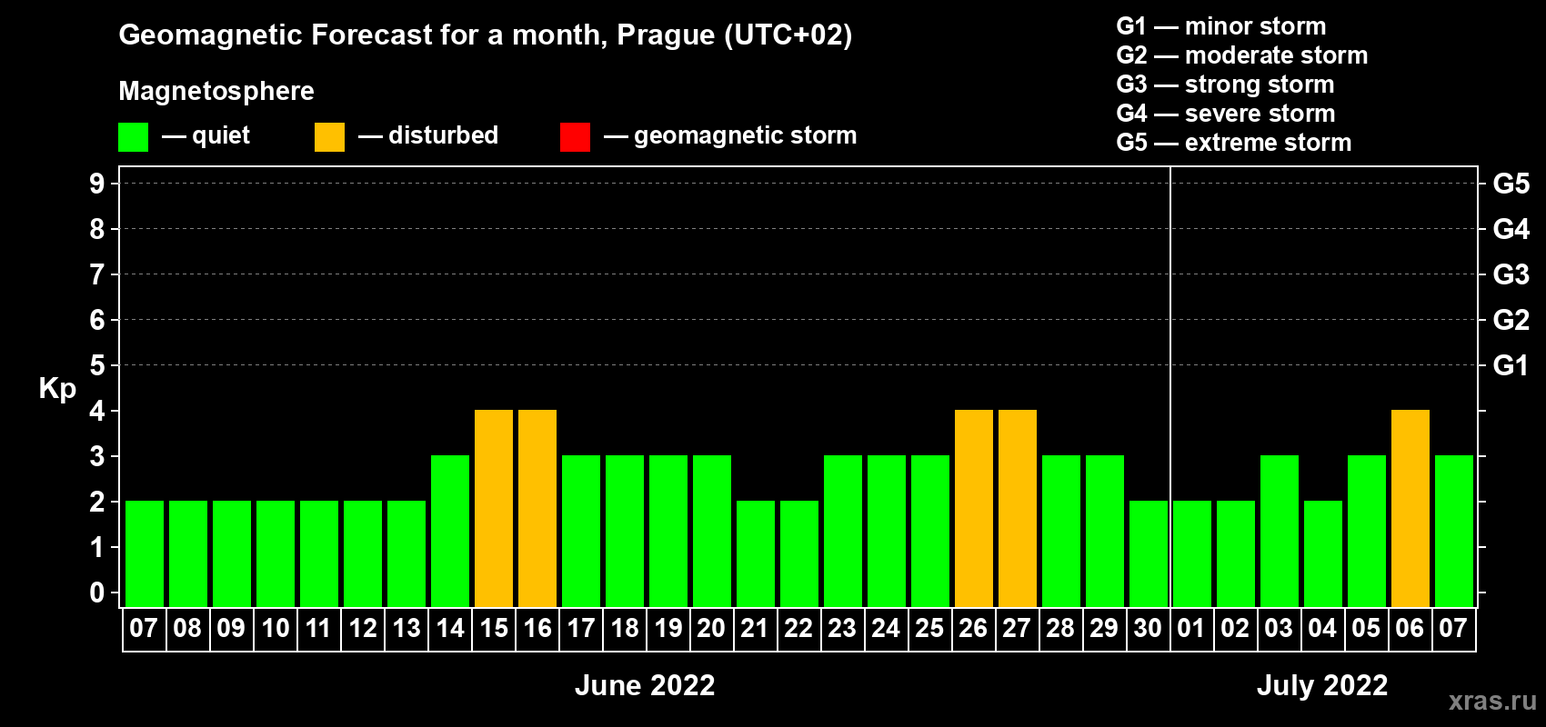 Geomagnetic storm forecast in Prague for Jun 07, 2022