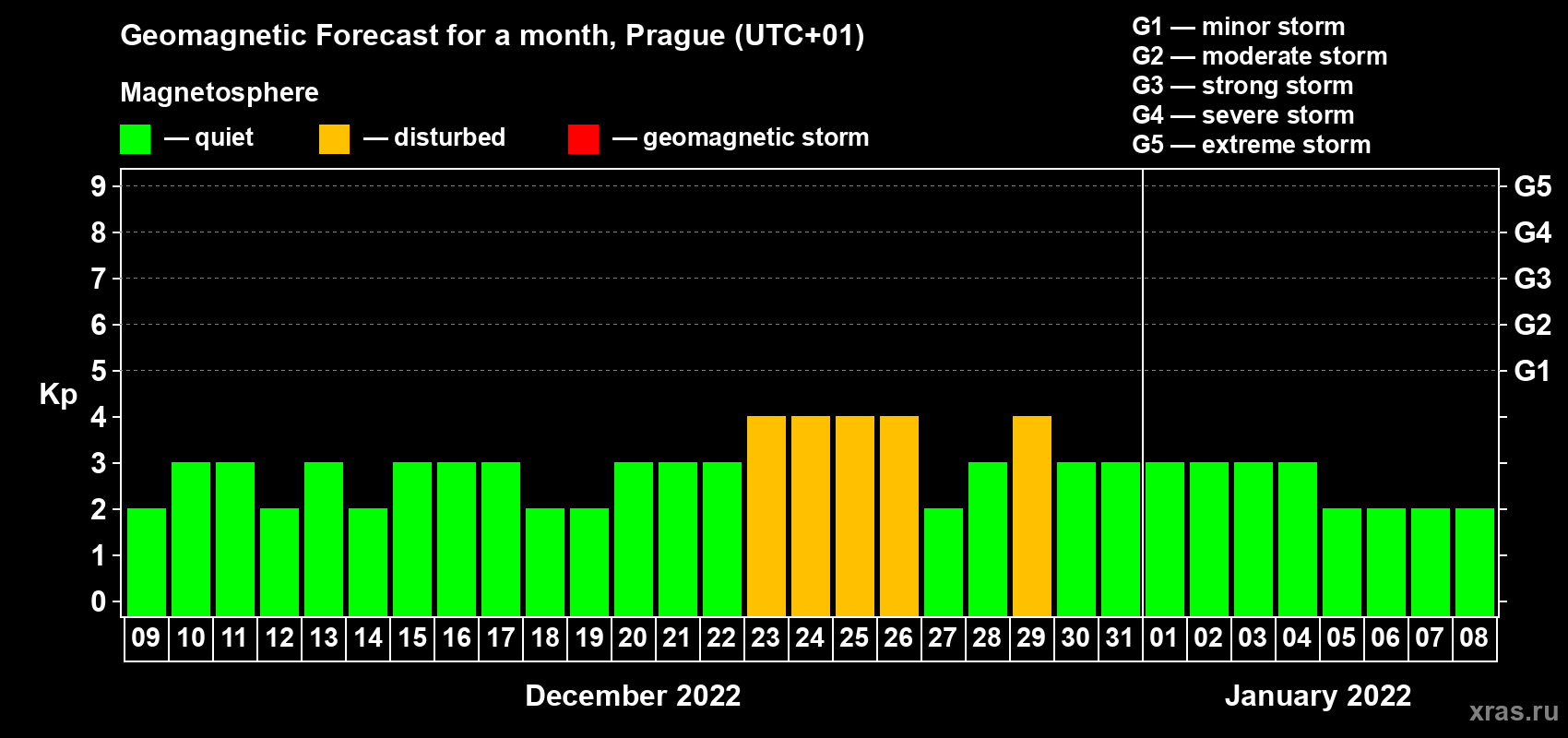 Geomagnetic storm forecast in Prague for Dec 09, 2021