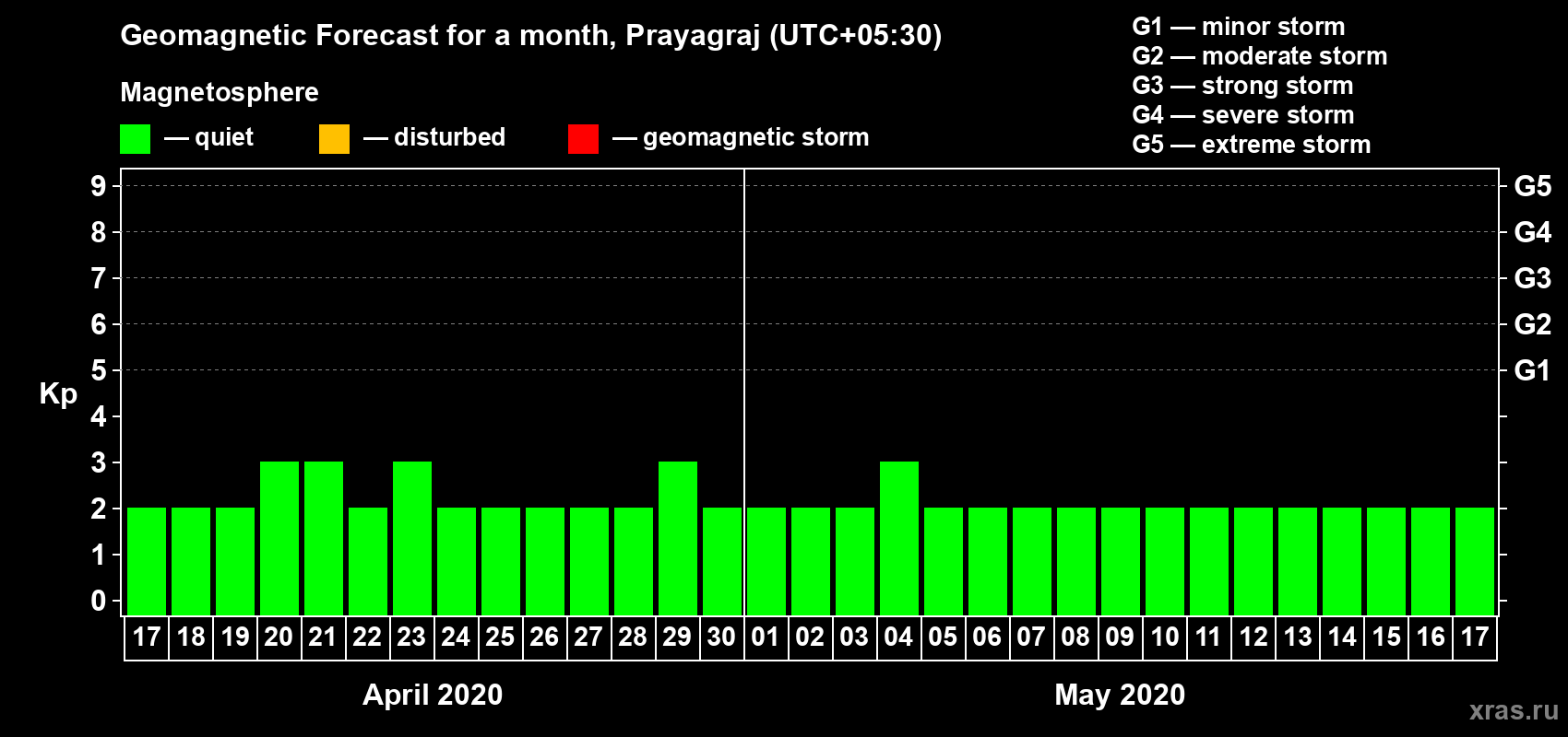 Geomagnetic storm forecast in Prayagraj for Apr 17, 2020